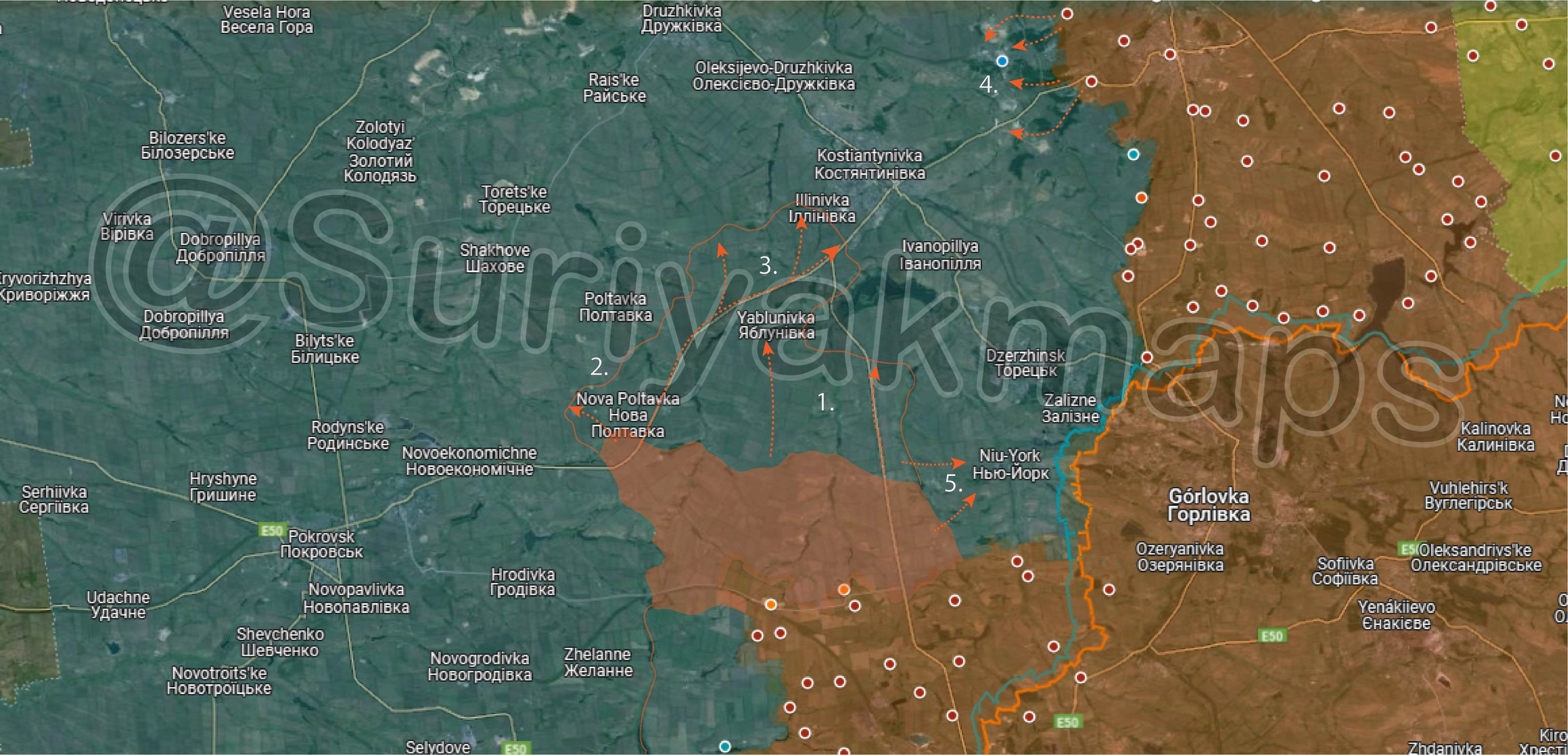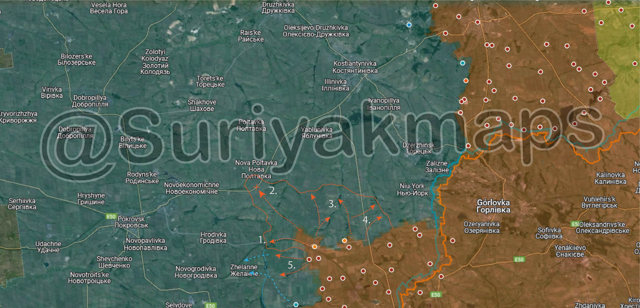 Phân tích này là một dự đoán dài hạn, sẽ diễn ra trong phần còn lại của mùa xuân và một phần của mùa hè. Hơn nữa, nó không tính đến sự phát triển có thể tồn tại trên các mặt trận khác, vì vậy rất khó để tính toán mức độ tiến bộ của Nga. Tuy nhiên, việc bắt giữ Ocheretyne sẽ không dễ dàng như vậy. Quân đội Ukraine đang gửi nhiều quân tiếp viện đến khu vực này để ngăn chặn những bước tiến của Nga, những bước tiến cuối cùng sẽ bị chậm lại, bên cạnh hệ thống phòng thủ của Ukraine đã được xây dựng. Có thể chúng ta đang nói về chân trời tấn công của Nga trong năm nay, sau đó Nga sẽ quay trở lại thế trận phòng thủ để phục hồi sau hao mòn. Mặt khác, sự xuất hiện của viện trợ Mỹ sẽ tạo động lực mới cho #UkrainianArmy chuẩn bị phản công trên một số mặt trận và phục hồi nhiều nhất có thể sau những tổn thất phải gánh chịu trong những tháng gần đây. Tuy nhiên, tình hình lực lượng của nước này đang ngày càng trở nên tồi tệ hơn, đặc biệt là do các vấn đề về quân đội mà nước này đang gặp phải và các đợt huy động mới sẽ phải giải quyết nếu chính phủ Ukraine thực sự muốn tiếp tục xung đột thêm vài năm nữa trong điều kiện tối ưu. Phần 1: #Quân đội Nga sẽ tiếp tục tiến về phía tây tới Prohres (1), nơi họ sẽ duy trì vị trí của mình. Việc chiếm được thị trấn này sẽ cho phép thiết lập hỏa lực kiểm soát nhằm vào quân Ukraine nằm ở phía đông Hồ chứa Karlivske, điều này sẽ cản trở hoạt động hậu cần của Ukraine trong khu vực này, lực lượng này sẽ rút lui khi quân Nga tiếp tục tiến dọc theo trục đó (5). Đồng thời, quân Nga sẽ tiến theo hai trục chính: - Mũi đầu tiên sẽ nhắm vào nút giao đường nằm trên quốc lộ H-32, nối Pokrovsk với Kostiantynivka (2). Đây sẽ là một đòn giáng mạnh vào việc tiếp viện và tiếp tế cho thành phố thứ hai vì Pokrovsk là tâm chấn của Donbass, chỉ còn lại con đường đến Kramatorsk là tuyến đường hậu cần chính. - Bước tiến thứ hai sẽ hướng về phía bắc, nhắm vào thị trấn Kalynove (3), dự kiến những bước tiến này sẽ cho phép mở lại trục đường cao tốc H-20 đi qua các thị trấn Oleksandropil và Panteleymonivka (4)