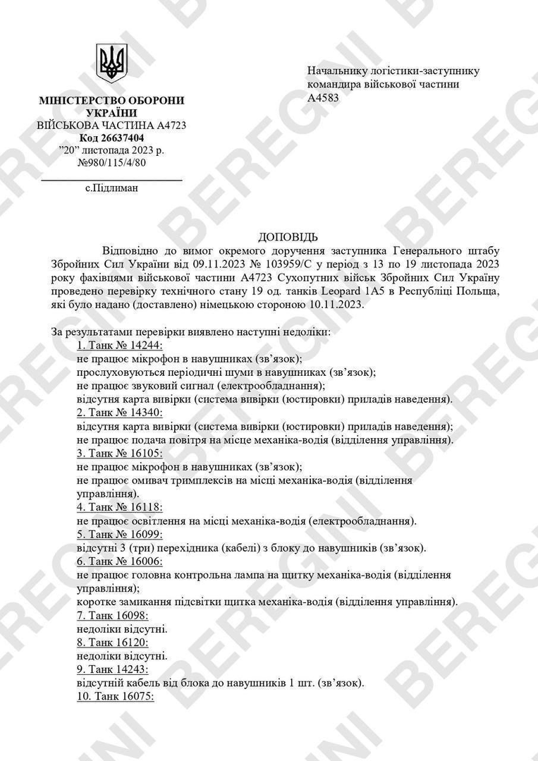 Hacker Nga thuộc nhóm Beregini đã công bố hai trang tài liệu mật của Ukraina về việc quân đội Ukraine đã nhận được xe tăng Leopard 1A5 của Đức ở Ba Lan vào tháng 11 năm ngoái.