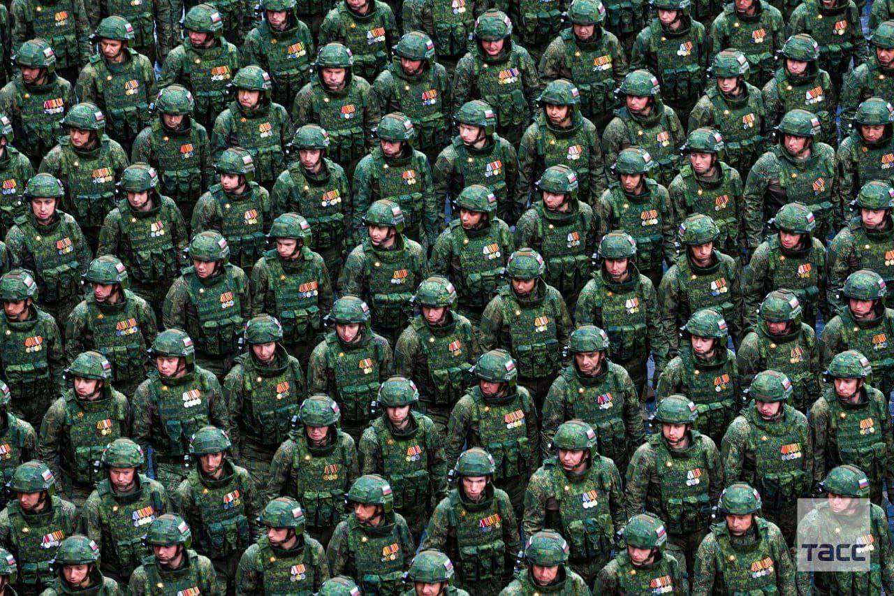 Khối cựu chiến binh Chiến dịch quân sự đặc biệt trong buổi tập dượt duyệt binh tại Moskva, 2024.