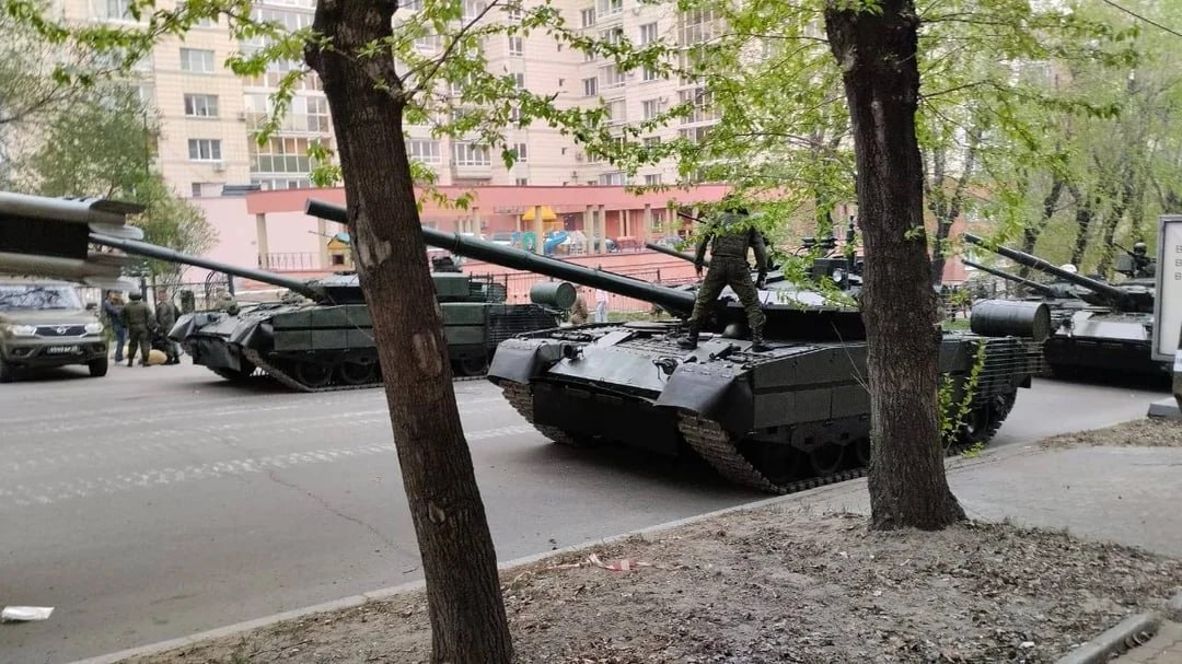 Xe tăng T-80BVM tập luyện cho duyệt binh 2024 tại Khabarovsk, 1 trong những thành phố xa nhất vùng Viễn Đông, Nga.