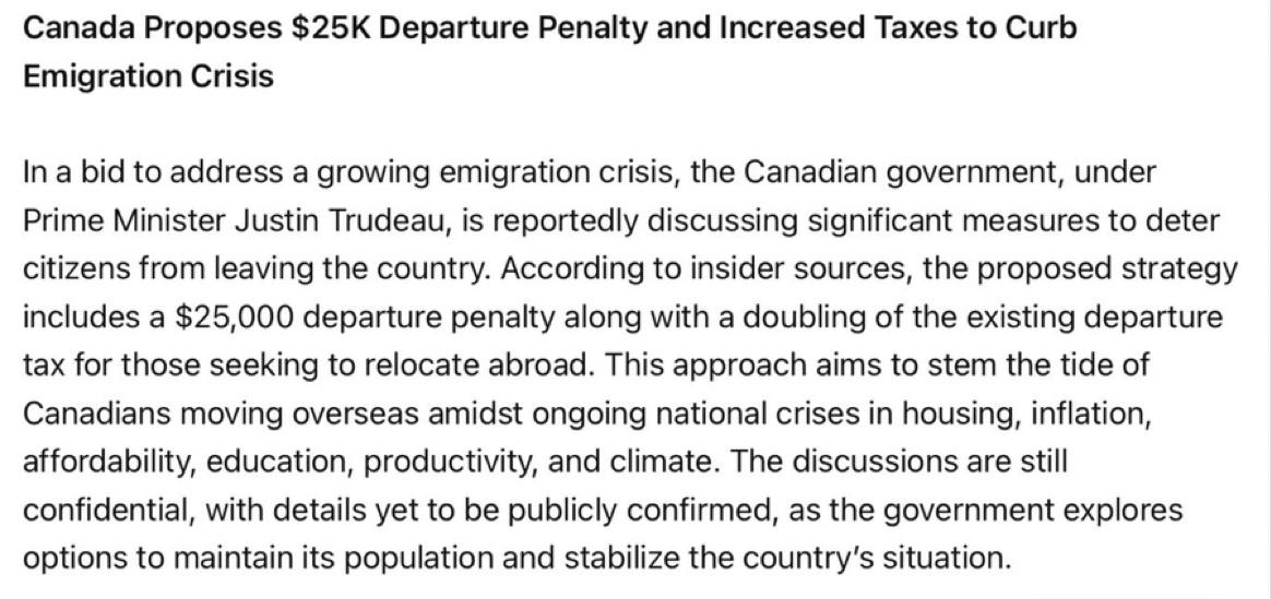 Chính phủ của Justin Trudeau đang lên kế hoạch tính phí xuất cảnh 25.000 USD cho những người Canada đang cố gắng chạy trốn khỏi cơn ác mộng mà ông đã tạo ra.