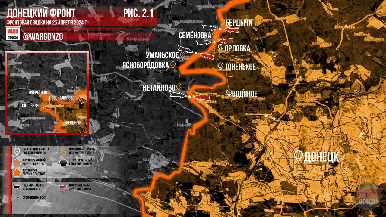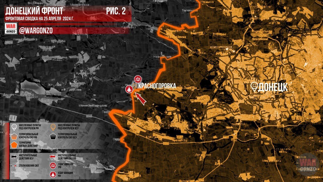 Trên mặt trận Donetsk, các hoạt động tấn công tích cực vẫn tiếp tục ở Krasnogorovka. Ở đó, quân đội Nga, được hỗ trợ bởi pháo binh và hàng không, đang tiến vào khu vực trung tâm của ngôi làng, nắm quyền kiểm soát phía nam thành phố. Tại khu vực Netailovo, Lực lượng vũ trang Ukraine vẫn đang kìm hãm sự tấn công dữ dội của quân đội Nga, nhưng những bước tiến nhỏ từ phía bắc của khu định cư này. Lực lượng vũ trang RF vẫn có nó. Giao tranh ác liệt vẫn tiếp tục. Ở Umanskoye, tình hình cũng tương tự - những trận chiến sắp diễn ra ở ngoại ô ngôi làng. Tại khu vực Semyonovka và Berdychi, Lực lượng vũ trang Ukraine tiếp tục kháng cự ngoan cố, làm chậm bước tiến của quân ta. Giao tranh ác liệt đang diễn ra. Tại Novobakhmutovka, do các hành động tấn công thành công của Lực lượng vũ trang Nga, lực lượng đồn trú của Ukraine đã rút lui về khu định cư Solovyovo liền kề. hoàn toàn nằm dưới sự kiểm soát của Lực lượng Vũ trang Nga. Quân đội Nga đã đạt được tiến bộ đáng kể và một chiến dịch dọn dẹp đang được tiến hành ở Ocheretino, nơi Lực lượng vũ trang Ukraine đã bị đẩy lui ra ngoài vùng ngoại ô phía tây của ngôi làng. Tại Novokalinovo, Lực lượng vũ trang Nga đang tiến vào bên trong khu định cư với giao tranh ác liệt. (Hình 2)