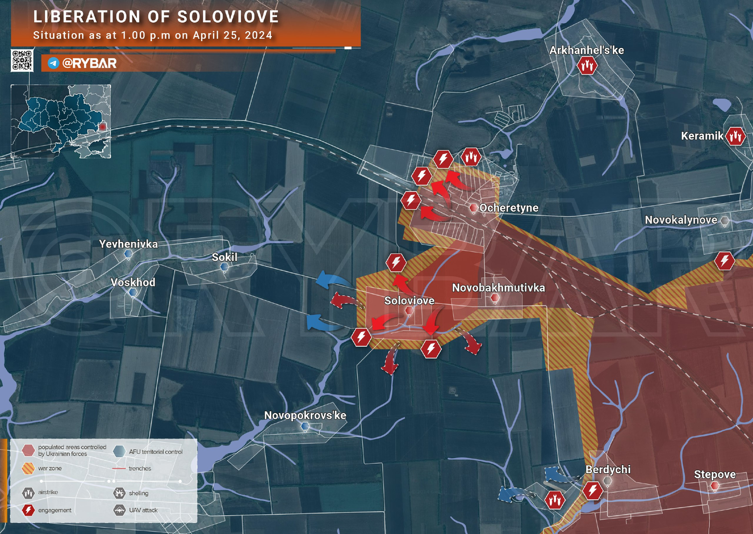 Theo hướng Chasovoyar, có các trận chiến vị trí ở ngoại ô phía đông Chasov Yar. Pháo binh và hàng không của Lực lượng Vũ trang Nga đang tích cực làm việc trên các vị trí của Lực lượng Vũ trang Ukraine. Tại khu vực Kleshcheevka, quân đội Nga đã tiến hành các hoạt động tấn công với những thành công nhỏ về mặt chiến thuật, nhưng việc tiến quân của Lực lượng vũ trang Nga trong khu vực này là vô cùng khó khăn do độ cao do quân Ukraine kiểm soát. Các cuộc tấn công trực diện nhanh chóng bị chặn lại bởi vũ khí tầm xa của Ukraine. (Hình 3)
