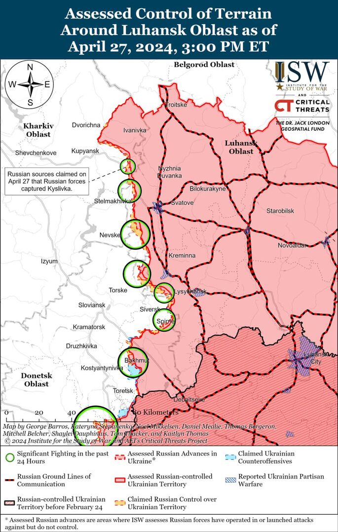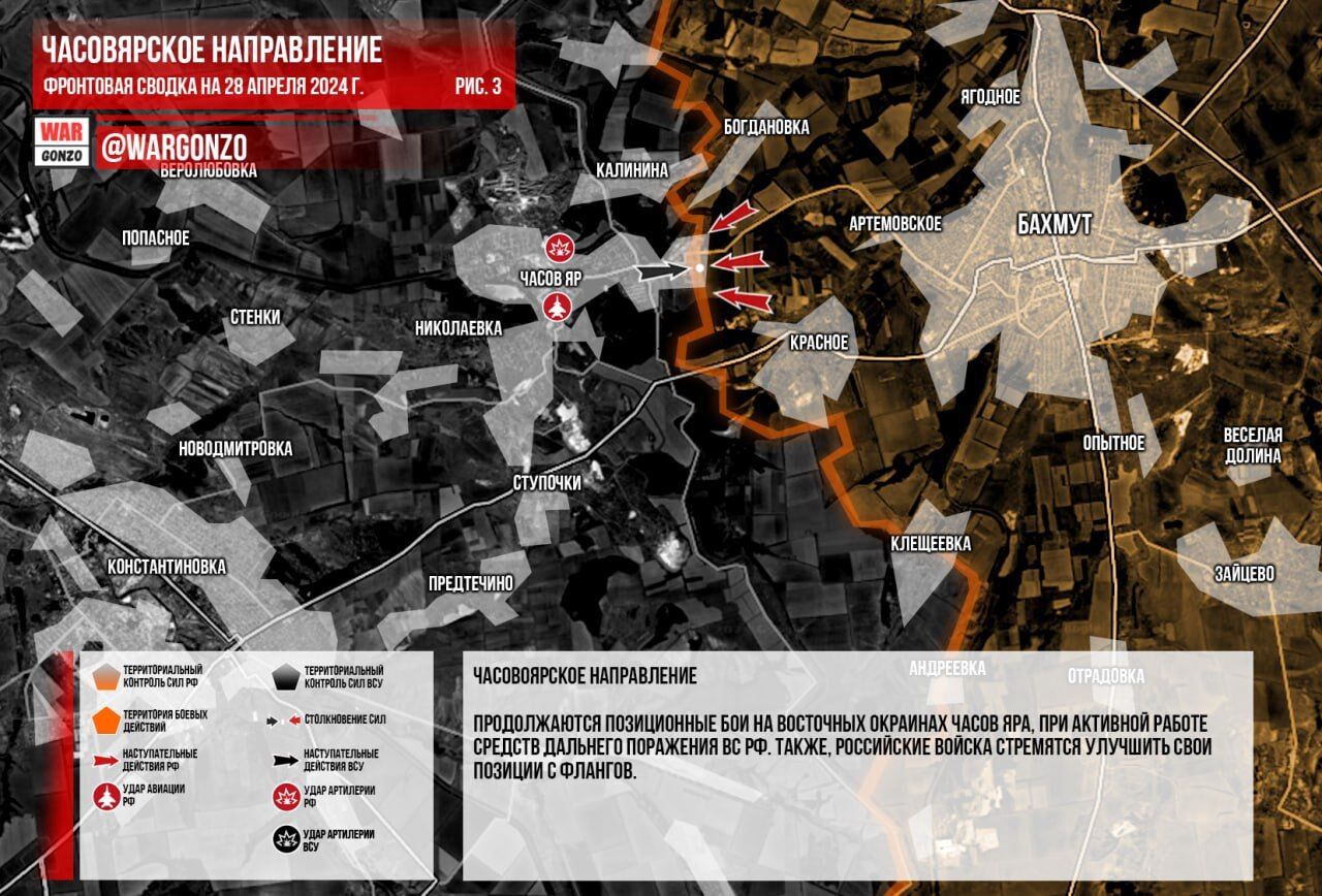 Không có thay đổi lớn nào về hướng Chasovoyarsk. Các trận chiến vị thế tiếp tục diễn ra ở vùng ngoại ô phía đông Chasov Yar, với sự hoạt động tích cực của vũ khí tầm xa của Lực lượng Vũ trang Nga. Ngoài ra, quân đội Nga đang tìm cách cải thiện vị trí của họ ở hai bên sườn. (Hình 3)