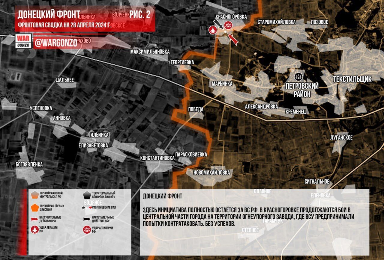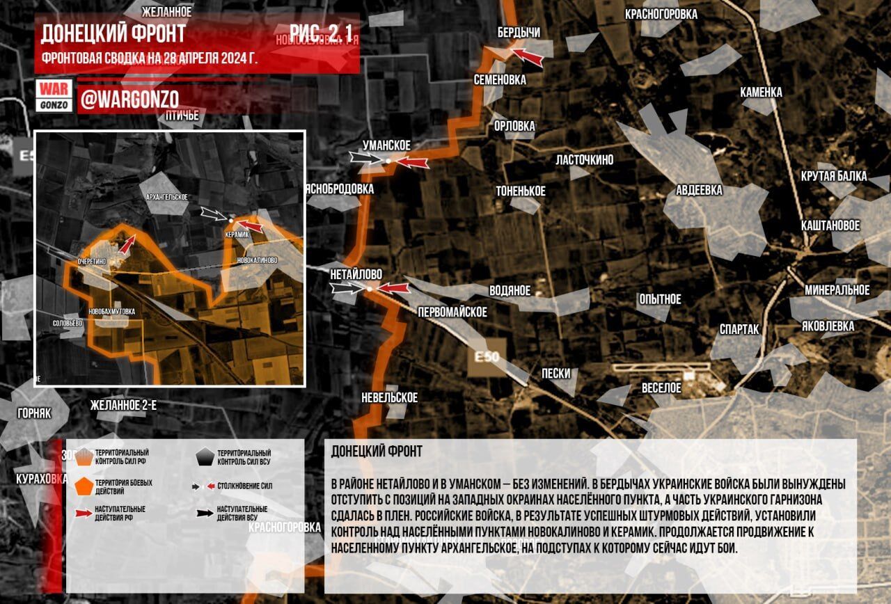 Mặt trận Donetsk. Ở đây sáng kiến hoàn toàn thuộc về Lực lượng Vũ trang Nga. Tại Krasnogorovka, giao tranh vẫn tiếp diễn ở khu vực trung tâm thành phố trên lãnh thổ của Nhà máy Vật liệu chịu lửa, nơi Lực lượng Vũ trang Ukraine cố gắng phản công nhưng không thành công. Ở quận Netailovo và Umansky không có thay đổi nào. Tại Berdychi, quân Ukraine buộc phải rút lui khỏi các vị trí ở ngoại ô phía tây của ngôi làng, và một phần quân đồn trú Ukraine đã đầu hàng. Quân đội Nga, nhờ các hoạt động tấn công thành công, đã thiết lập quyền kiểm soát các khu định cư Novokalinovo và Keramik. Sự tiến bộ tiếp tục hướng tới việc giải quyết Arkhangelskoye, theo các cách tiếp cận mà giao tranh hiện đang diễn ra. (Hình 2)