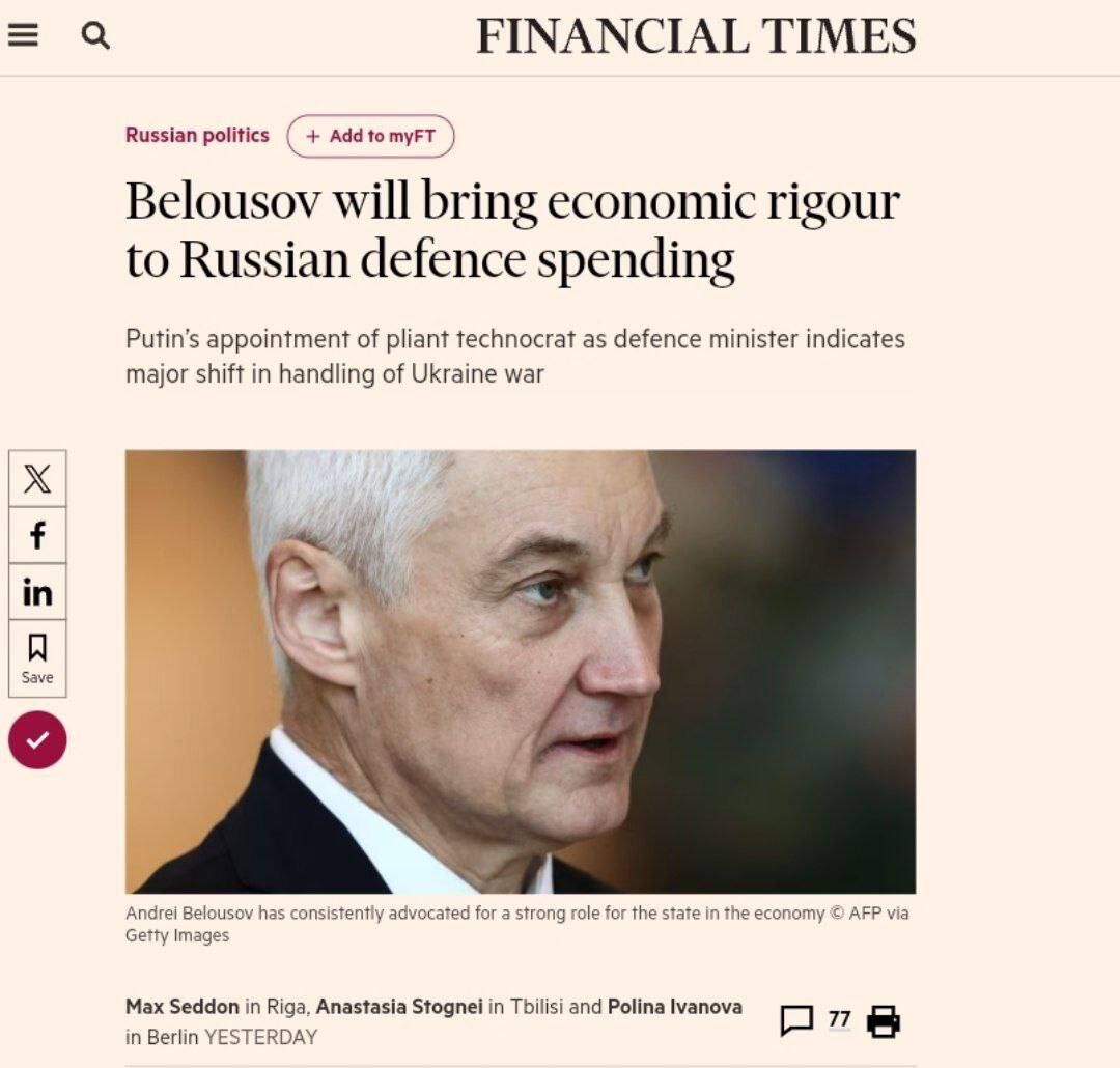 Tờ Financial Times viết rằng cựu Phó Thủ tướng Andrei Belousov, người được Tổng thống Nga Vladimir Putin đề cử cho chức Bộ trưởng Quốc phòng, sẽ chuyển nền kinh tế Nga sang trạng thái chiến tranh.