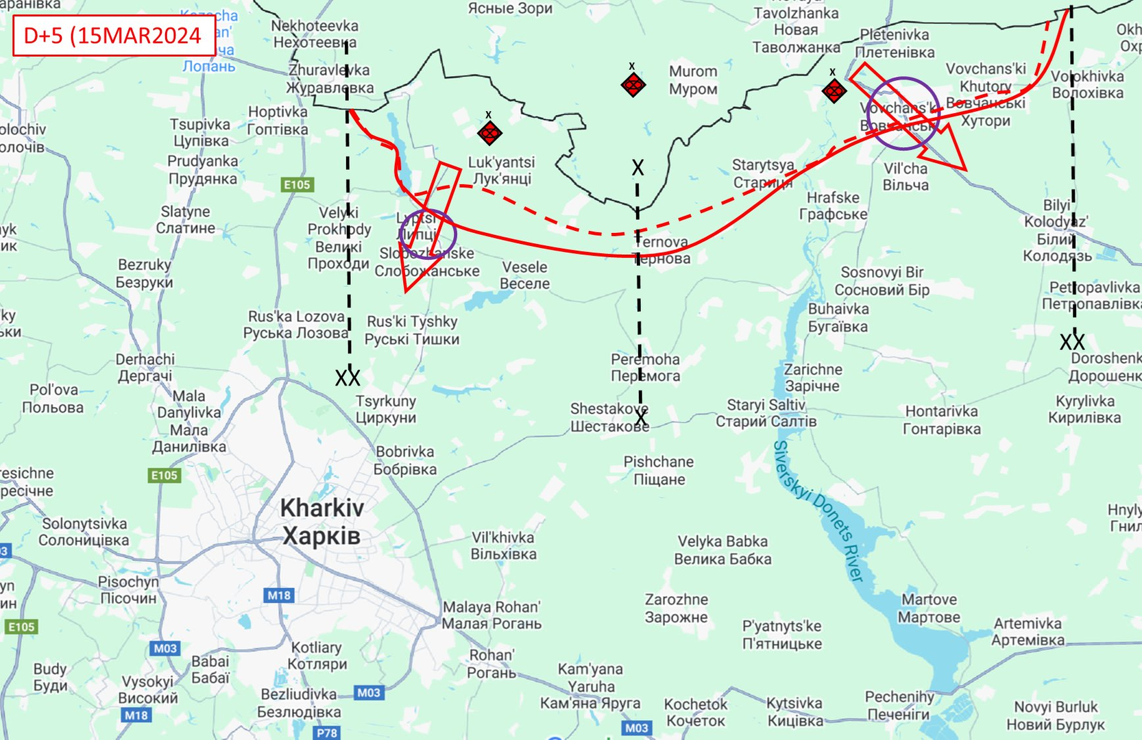 Trong 48 giờ qua, lực lượng Nga đã chuyển từ "đe dọa" thị trấn Liptsi sang chủ động tấn công vào đó. Tương tự, cách đó 50km về phía đông, các lực lượng Nga đã chuyển từ áp sát thị trấn Volchansk sang có vẻ như đã chiếm được phần phía bắc và chuẩn bị tấn công qua sông Vovcha (một nhánh của Seversky Donets) để tiến vào phần phía nam. Họ cũng đã kết nối chắc chắn hai mũi nhọn vào lãnh thổ Ukraine, chiếm giữ ít nhất một phần thị trấn Ternovo giữa hai điểm đó.