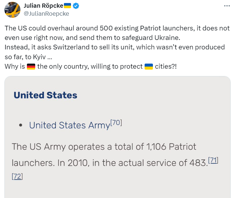 Mỹ có thể đại tu sửa chữa khoảng 500 bệ phóng Patriot hiện có mà nước này thậm chí không sử dụng ngay bây giờ và gửi chúng đến bảo vệ Ukraine. Thay vào đó, họ yêu cầu Thụy Sĩ bán thiết bị của mình, thậm chí cho đến nay vẫn chưa được sản xuất, cho Kyiv… Tại sao Đức là quốc gia duy nhất sẵn sàng bảo vệ Ukraine ?
