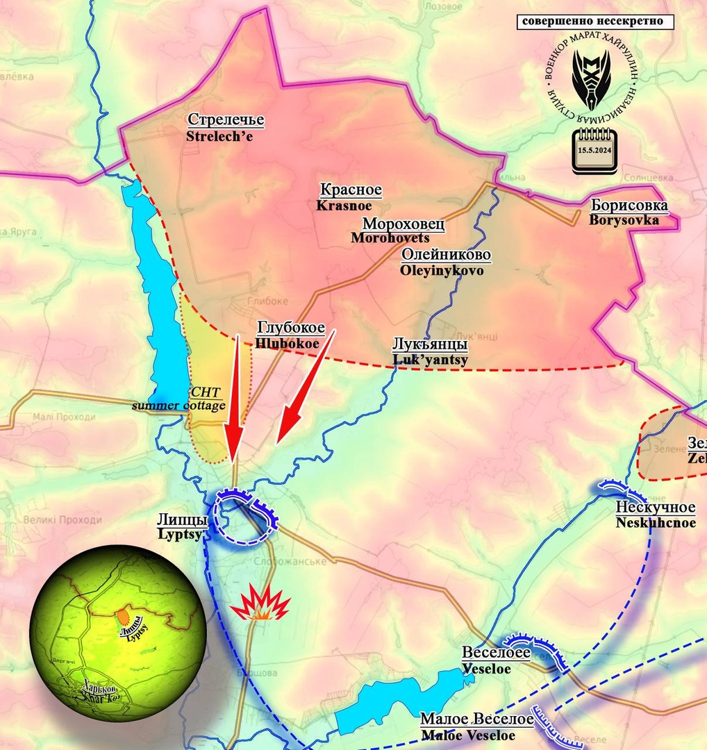 Đồng thời, một bộ phận khác của nhóm Kharkov của Lực lượng Vũ trang Nga đang tấn công các vị trí của Lực lượng Vũ trang Ukraine ở Volchansk và Staritsa sẽ tiếp tục mở rộng đầu cầu dọc sông Seversky Donets và di chuyển về hướng Getmanovka. và Shevchenkovo để cắt nguồn cung cấp cho nhóm Kupyansk. Địa lý tự nhiên - r. Seversky Donets cùng lực lượng hộ tống không quân và pháo binh sẽ bao vây sườn phải của quân Nga, đồng thời các cây cầu dọc sông sẽ bị phá hủy, và mối đe dọa tấn công vào Kharkov (từ Lipitsa) sẽ không cho phép các đơn vị Ukraine rời khỏi thành phố.
