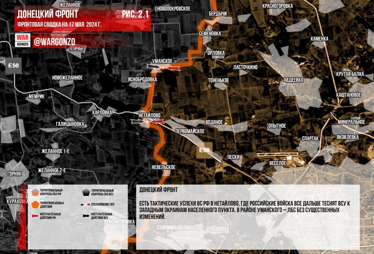 Mặt trận Donetsk. Trận chiến đô thị tiếp tục diễn ra ở Krasnogorovka LBS mà không có bất kỳ thay đổi đặc biệt nào. Có những thành công về mặt chiến thuật của Lực lượng vũ trang Nga ở Netailovo, nơi quân đội Nga đang đẩy Lực lượng vũ trang Ukraina ngày càng tiến xa hơn về phía ngoại ô phía tây của khu định cư. Ở khu vực Umansky - LBS không có thay đổi đáng kể. Giao tranh vẫn tiếp tục trên đường tới Novopokrovsky. Ngoài ra, Lực lượng vũ trang Nga tiếp tục tiến về phía Novoaleksandrovka. (Hình 2)