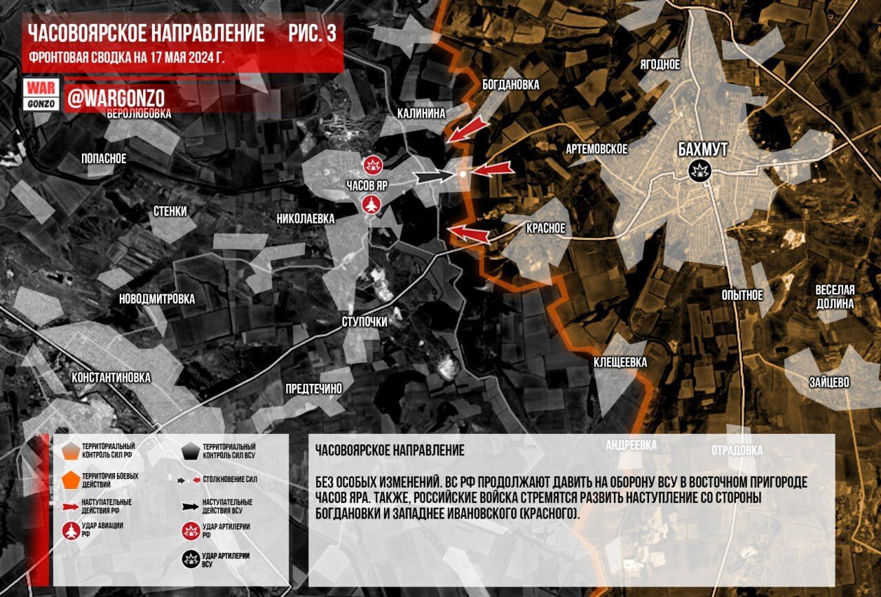 Trên hướng Chasovoyarsk Không có thay đổi lớn. Lực lượng vũ trang Nga tiếp tục gây áp lực lên lực lượng phòng thủ của Lực lượng vũ trang Ukraine ở vùng ngoại ô phía đông Chasov Yar. Ngoài ra, quân đội Nga đang tìm cách phát triển một cuộc tấn công từ Bogdanovka và phía tây Ivanovsky (Đỏ). (Hình 3)