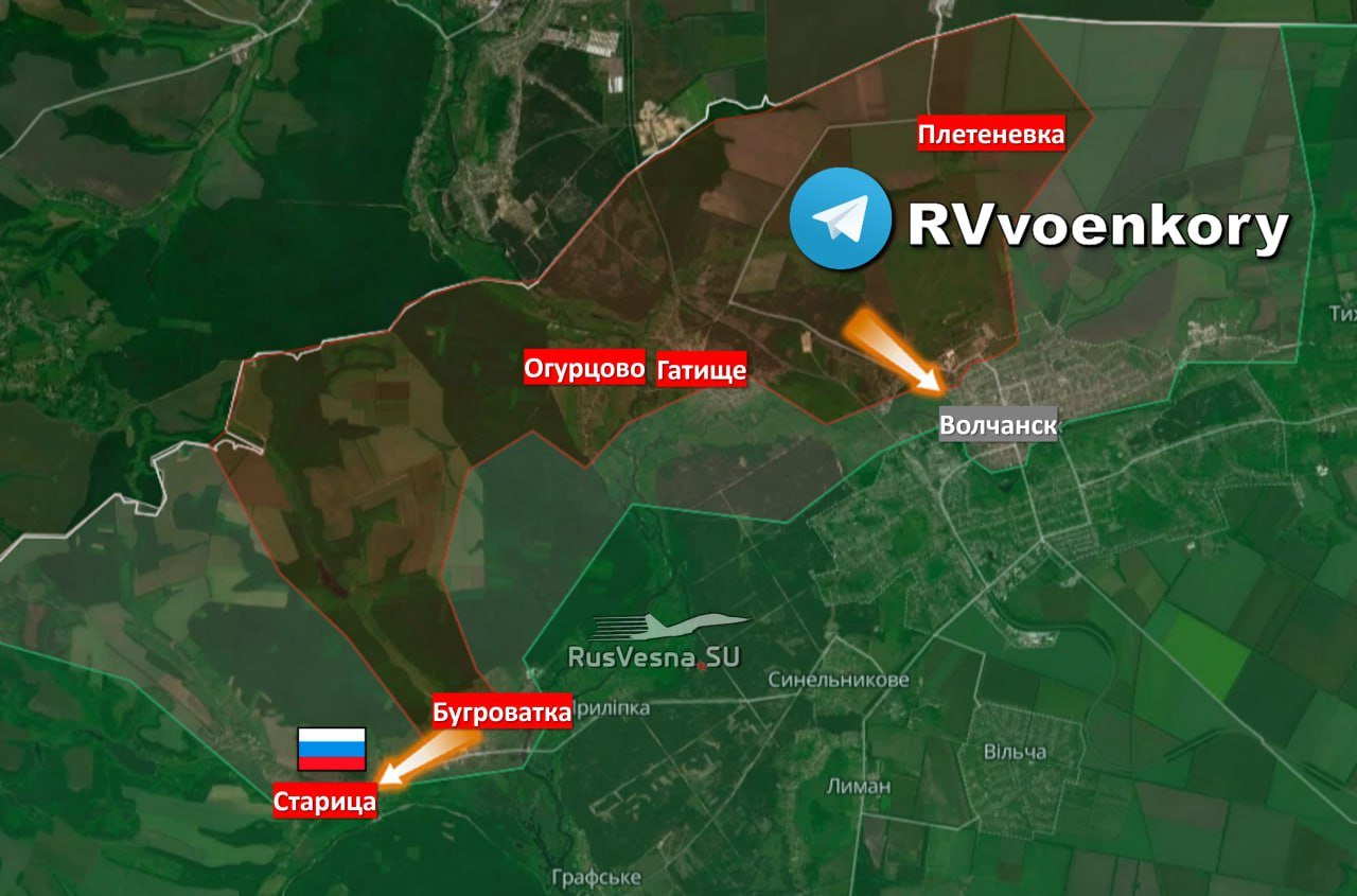 "Nhóm miền Bắc đã giải phóng làng Staritsa gần Volchansk ▪️Các đơn vị của chúng ta cũng tiếp tục tiến vào trung tâm Volchansk và hai bên sườn, đe dọa chiếm thành phố trong thế gọng kìm. ▪️Bộ Tổng tham mưu Lực lượng vũ trang Ukraine trước đó báo cáo rằng giao tranh trong ngày đã diễn ra tại khu vực làng Staritsa, cũng như theo hướng Glubokoye - Liptsy."