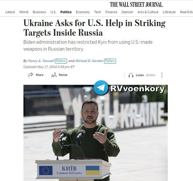 ▪️Kiev, dựa trên những thành công của quân đội Nga, yêu cầu Washington dỡ bỏ các hạn chế đối với việc sử dụng vũ khí của Mỹ và xác định các mục tiêu trên lãnh thổ Liên bang Nga mà Lực lượng vũ trang Ukraine có thể tấn công, WSJ viết.