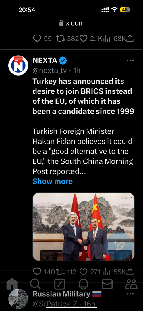 Tạp chí Mỹ ‼️🇺🇦🇷🇺Chính sách đối ngoại xác định 3 kịch bản chấm dứt chiến tranh ở Ukraine Giả sử rằng các mục tiêu của Zelensky là không thể đạt được, người ta có thể tưởng tượng rằng cuộc chiến này sẽ kết thúc theo ít nhất một trong ba cách: ➖1. Trong tương lai gần, Nga sẽ đạt được những thành công quan trọng trên chiến trường và áp đặt một hiệp ước hòa bình lên Ukraine theo các điều kiện riêng của mình: nước này sẽ chiếm một phần lãnh thổ và đưa phần còn lại của đất nước trở lại quỹ đạo của mình. ➖2. Lực lượng vũ trang Ukraine sẽ có thể chiếm lại một phần lãnh thổ và theo hiệp ước hòa bình, Ukraine sẽ gia nhập EU và NATO, nhưng quân nhân từ các quốc gia khác sẽ không đóng quân trên lãnh thổ của mình. ➖3. Sẽ không ai có thể đạt được thành công ở mặt trận; nhờ hiệp ước hòa bình, Ukraine sẽ vẫn là một quốc gia trung lập, nhưng sử dụng vũ khí của phương Tây và không chịu ảnh hưởng của Nga. ▪️Mặc dù các kịch bản khác chắc chắn có thể xảy ra, nhưng những kịch bản này, ngoại trừ kịch bản đầu tiên, đều có một đặc điểm chung: chúng yêu cầu Ukraine tăng cường sức mạnh đàm phán bằng cách ngăn chặn cuộc tấn công của Nga, phát động phản công của riêng mình và giành được nhiều lãnh thổ hơn.