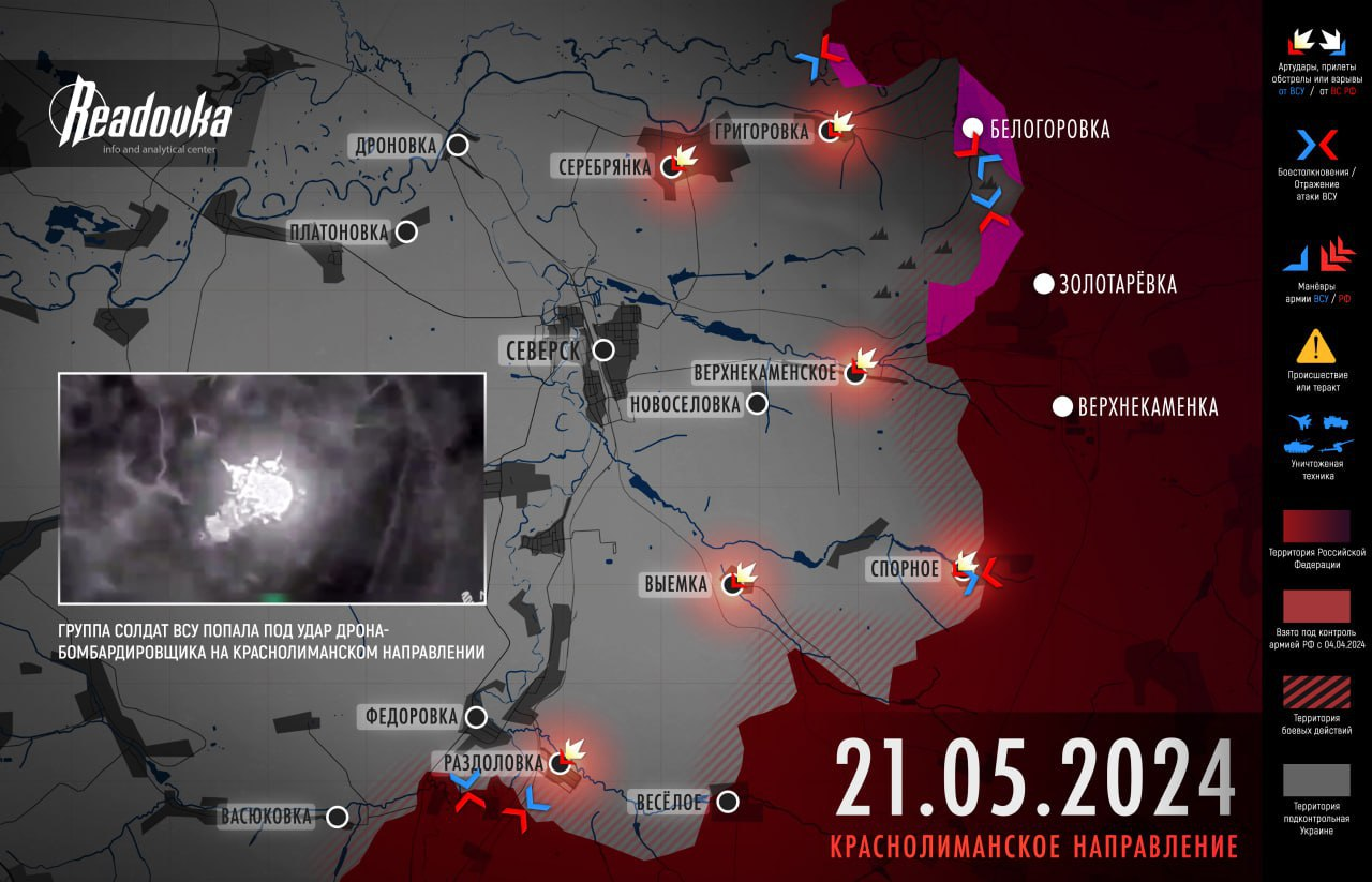 Khả năng vượt qua Lực lượng vũ trang Ukraine ở Seversk của Nga, chiếm được điểm cao quan trọng ở Kleshcheevka, tầm quan trọng của việc kiểm soát Belogorovka và cuộc điều động nghi binh của quân đội Nga trên bờ sông Volchya - xem xét chi tiết về tình hình trên chiến trường mặt trận vào cuối ngày 21 tháng 5