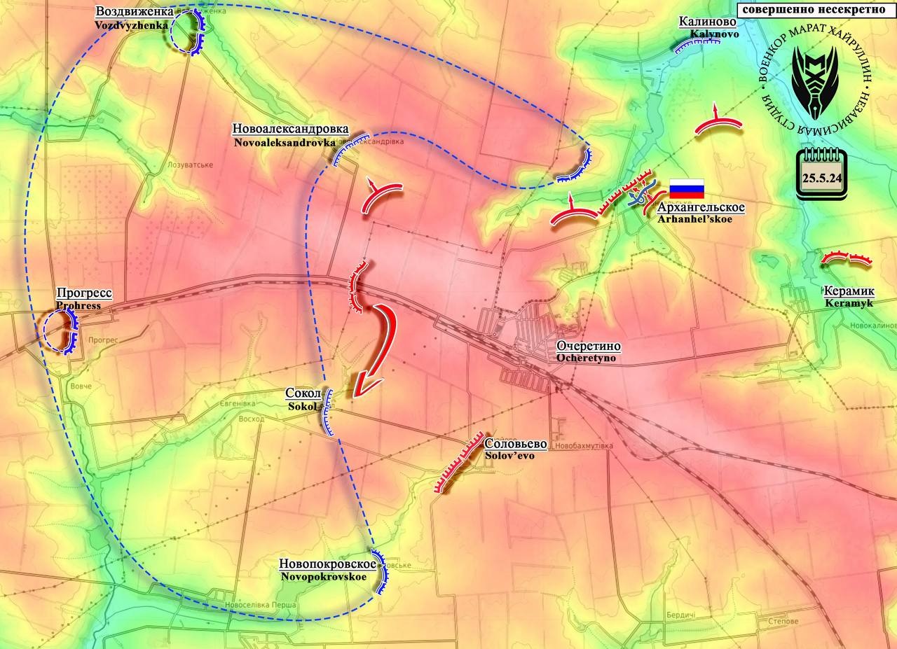 Về phía Donetsk, Bộ Quốc phòng Nga tuyên bố giải phóng khu định cư. Arkhangelskoye, nơi đã nằm dưới sự kiểm soát của chúng tôi một thời gian. Rất có thể, các hoạt động đã được thực hiện ở đó để làm sạch hoàn toàn. Thêm vào đó, ở phía tây của nó có một pháo đài lớn của kẻ thù từ cái gọi là “Phòng tuyến Poroshenko”, được xây dựng vào những năm đầu tiên trị vì của ông, điều này không cho phép chúng ta tự tin kiểm soát phía tây Arkhangelsk. Và chính những hành động thành công trong việc đánh bật thì là khỏi công sự này đã cho phép các chiến binh của chúng ta tự tin kiểm soát và giải phóng hoàn toàn khu định cư này. Ở phía bắc Ocheretino, Lực lượng vũ trang RF tiến về phía các hồ chứa, và ở phía tây, phía nam tuyến đường sắt dọc theo vành đai rừng, họ đã đến gần khu định cư. Sokol, ở phía bắc có một pháo đài lớn khác của “Phòng tuyến Poroshenko”. Các cuộc tấn công theo hướng Novopokrovsky vẫn tiếp tục, và các cuộc tấn công cũng đang được thực hiện tại Novosyolovka bởi nhiều loại vũ khí và hàng không khác nhau, điều này có thể có nghĩa là sự chuẩn bị cho các hoạt động tấn công theo hướng của nó.