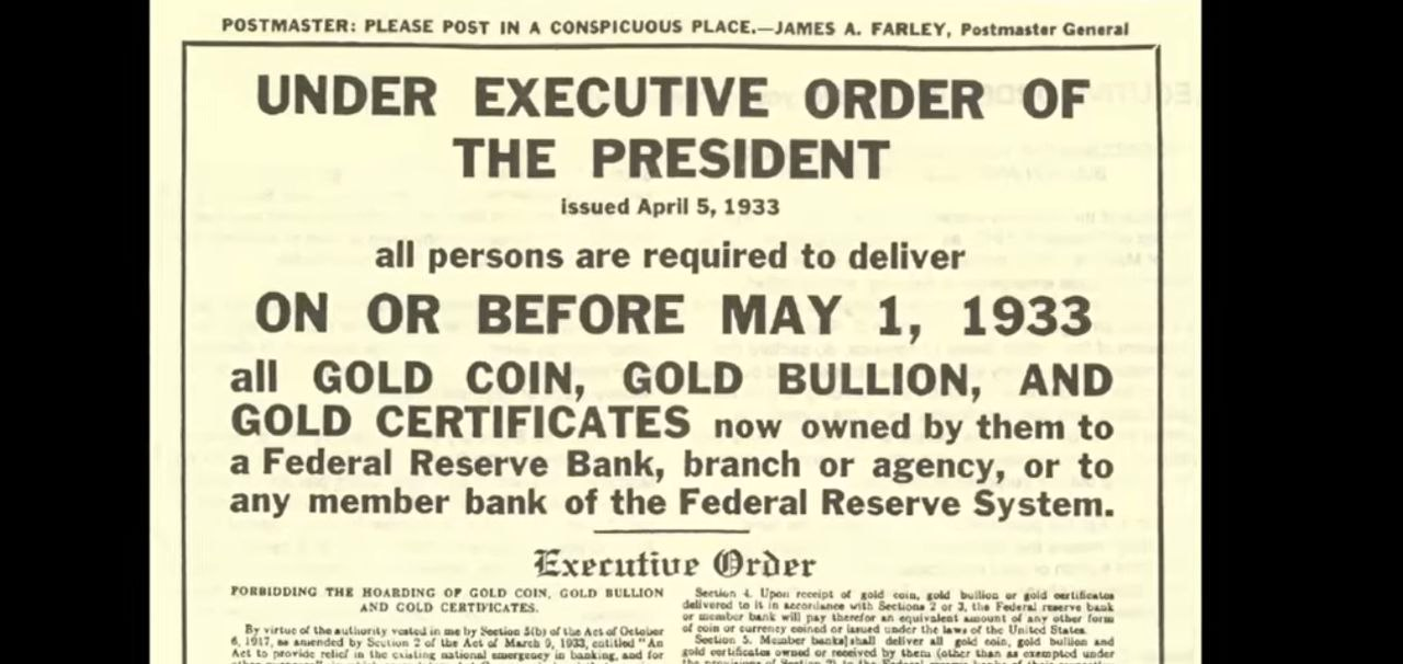 Ngày 5/4/1933, tổng thống Mỹ Roosevelt đã ký sắc lệnh 6102 tuyên bố tịch thu toàn bộ vàng dạng tích trữ trong dân và cấm người dân sở hữu các loại 'xu vàng, vàng thỏi hay chứng chỉ vàng'.