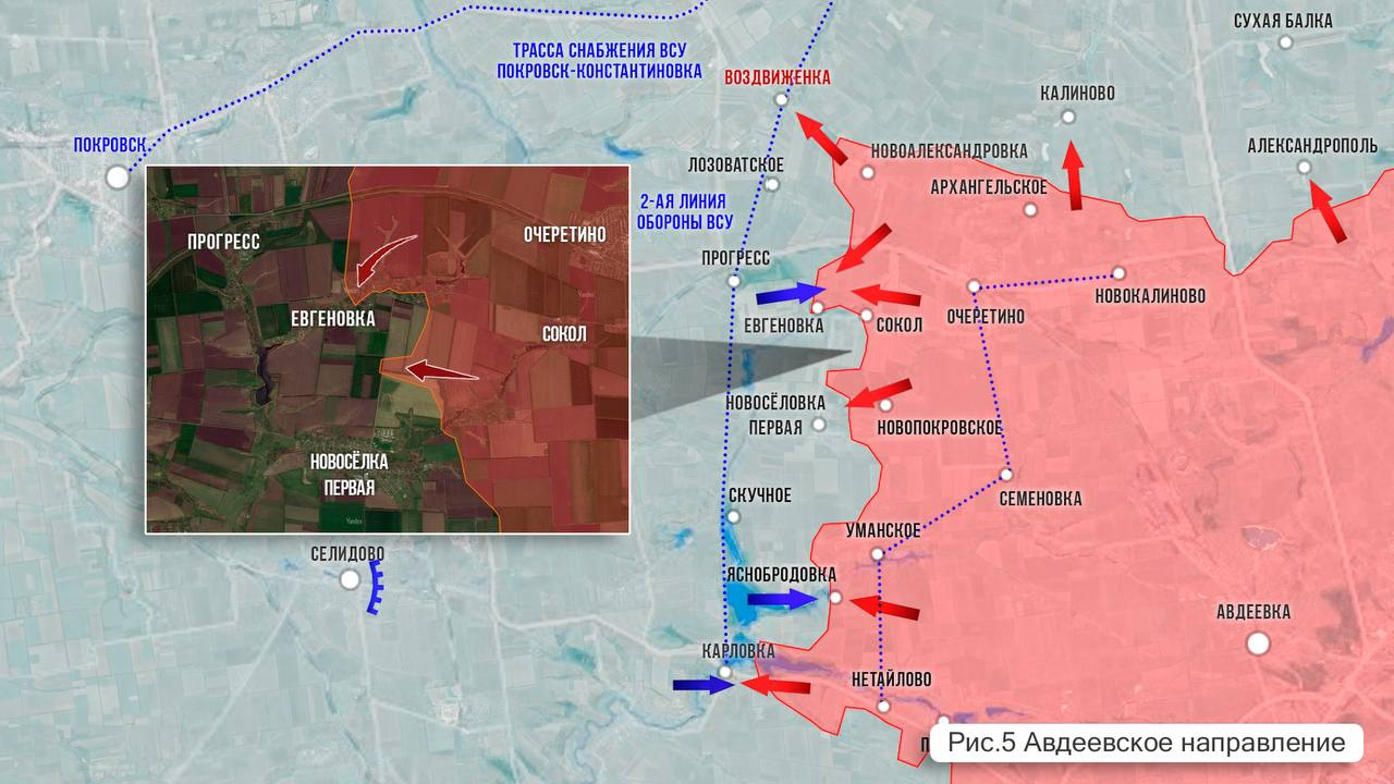 Theo hướng Avdiivka, bước tiến của Lực lượng vũ trang Nga cũng được quan sát thấy ở một số lĩnh vực. Quân Nga đang đẩy lui quân địch ở khu vực Yevhenivka và Novoselivka First.
