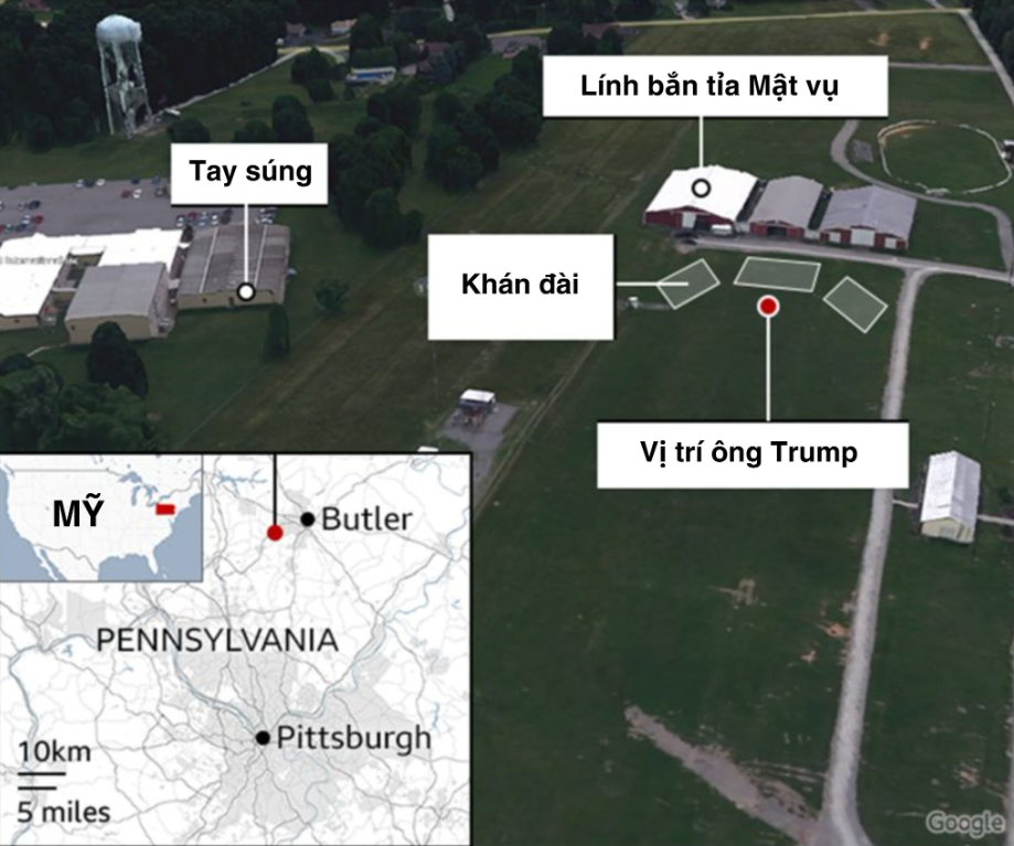 Mời các cụ xem sơ đồ vị trí cuộc vận động tranh cử của Trump hôm bị bắn.