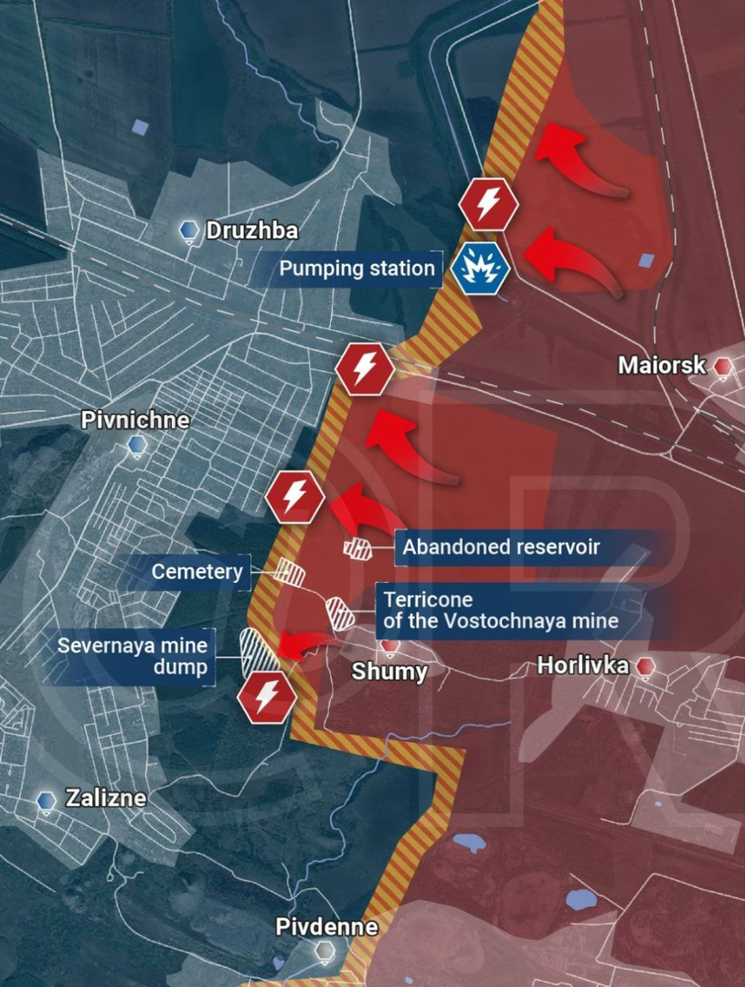 Thế trận tại bắc Donetsk đang có những tiến triển mới. Quân đội Nga đã giải phóng hết các lãnh thổ trung gian xung quanh làng Shumy và áp sát khu định cư Pivnichne. Tuy nhiên chỉ là sự khởi đầu, vì cụm phòng thủ liên hợp Druzhba, Pivnichne và Zalizne là một nơi không thể xem thường. Chúng đã được Kiev xây dựng kiên cố từ năm 2014.