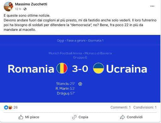 Tại đại học Torino, Italia, giáo sư Massimo Zucchetti, giám đốc Trung tâm Nghiên cứu phân tích hòa bình, đã bị trường đại học này buộc thôi việc, đồng thời nhận được nhiều mối đe dọa tính mạng vì đã post 1 bài post lên facebook với nội dung như sau, sau khi Ukraina thua Rumani 3-0: "Đây là 1 tin tuyệt vời. Bọn này cần phải bị loại càng sớm càng tốt. Nhìn thấy họ là tôi thấy khó chịu rồi. Quốc trưởng của họ cần họ chiến đấu bảo vệ 'dân chủ' đúng không? Quá đẹp còn gì, thêm 22 lính để ném vào cối xay thịt". Đỉnh cao “tự do ngôn luận”, “tự do Internet” mà phương Tây khoe khoang, đồng thời sử dụng để rêu rao, lên án khi ở ta xử lý các trường hợp tương tự (là các trường hợp lợi dụng các vấn đề trong nước để chống phá chứ không phải nói về vấn đề ngoài nước). (FB Ngô Mạnh Hùng)