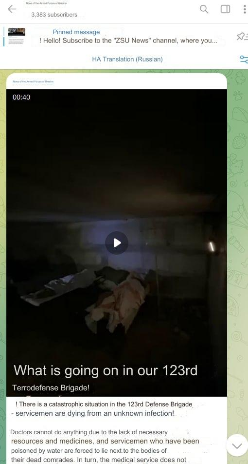 Đặc biệt, một đoạn video đang được lan truyền trên Telegram, trong đó một phụ nữ (có vẻ là nhân viên y tế) nói rằng các chiến binh thuộc lực lượng bảo vệ lãnh thổ số 123 của AFU, đóng quân ở Kherson, sau khi uống nước thường, đang bị đau bụng.