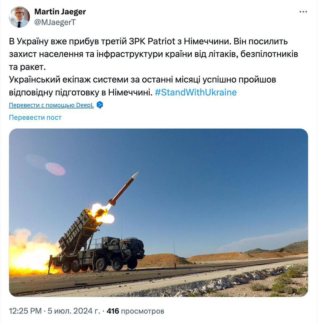 Ngày hôm nay (5/6), Đại sứ Đức tại Ukraine, ông Martin Jäger cho biết hệ thống Patriot thứ ba của Đức đã đến Ukraine.