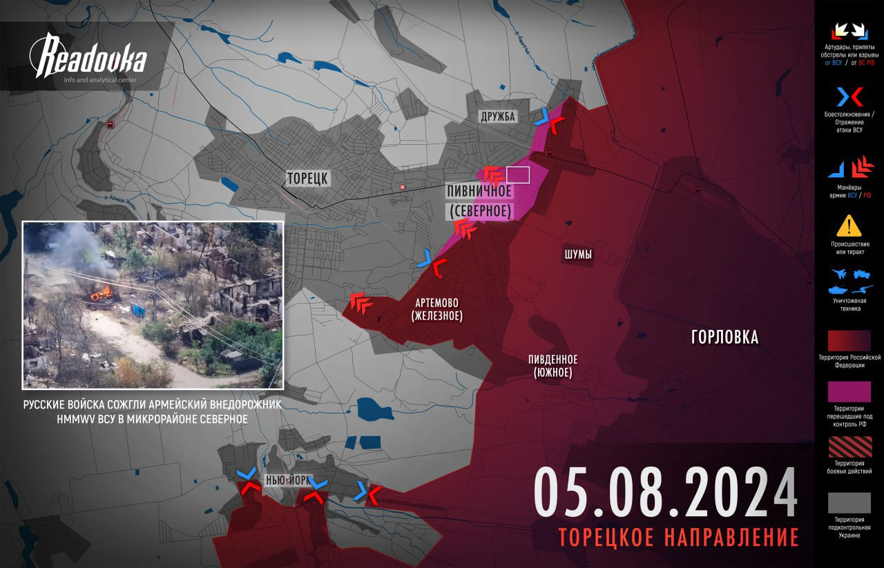 Trong vùng tích tụ Toretsk, quân đội Nga đã đạt được thành công trên một số lĩnh vực cùng một lúc. Tại Druzhba, Lực lượng vũ trang Nga đã tiến công và chiếm đóng tòa nhà của trường học. Trong tiểu khu Severnoe, binh sĩ của chúng tôi cũng hạ gục Ukraine, đẩy chúng về phía tây. Mỏ cùng tên và đống rác thải của nó đã được Lực lượng vũ trang Ukraine biến thành "công sự" và thay vì tấn công trực diện, quân đội Nga bắt đầu vượt qua chúng từ phía bắc dọc theo Phố Dzerzhinsky.