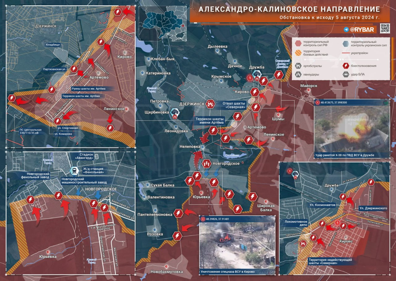 Theo hướng Oleksandro-Kalinovo, lực lượng Nga đã phá vỡ hệ thống phòng thủ của AFU tại một số khu vực. Quân đội Nga đã kiểm soát một số đường phố ở Druzhba và Kirovo, cũng như một kho trên lãnh thổ của mỏ Severnaya.