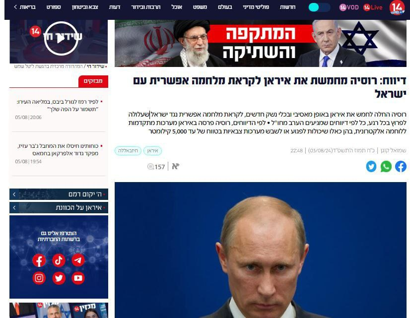 “Nga đã bắt đầu trang bị vũ khí mới cho Iran, chuẩn bị cho một cuộc chiến tranh có thể xảy ra với Israel, có thể nổ ra bất cứ lúc nào,” Kênh 14 tuyên bố