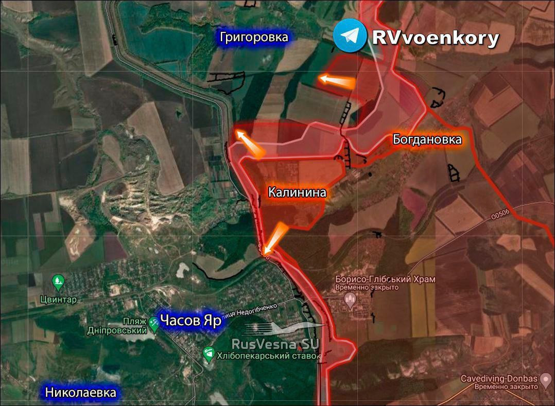 Sau khi kiểm soát hoàn toàn phần bờ đông của khu định cư Kalinina, quân đội Nga đã mở rộng vùng kiểm soát dọc theo kênh đào Seversky Donets-Donbass. Các điểm phòng thủ địch dọc bờ sông gần Chasok Yar liên tục bị pháo kích, không kích và uav của quân ta tấn công. Quân đội Nga đang cố gắng giải phóng hết toàn bộ lãnh thổ dọc theo bờ sông để tạo điều kiện thuận lợi cho quân ta vượt sông trong tương lai gần.