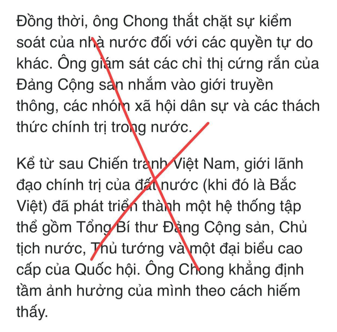 "Tuy nhiên, đối với nhiều người ở Việt Nam, những thành công trong chính sách đối ngoại và các chiến dịch chống tham nhũng của ông Chong được coi là yếu tố trung tâm trong di sản của ông." - 24tv U cà dẫn lời WashingtonPost.