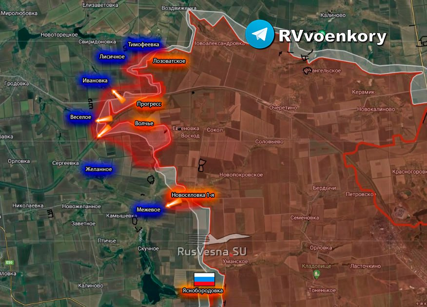 Từ Tiến, quân ta tiếp tục tiến dọc theo đường sắt về phía Zhelanny và đến Vesyoly. Nhưng khó có khả năng Lực lượng Vũ trang Nga sẽ tạo ra bước đột phá mới nếu không tăng cường sức mạnh cho hai bên sườn - giải phóng Ivanovka và Vesely. Lực lượng vũ trang Ukraine có lẽ đã rút được các trung tâm chỉ huy quân sự và trung tâm liên lạc khỏi Zhelanny, và do đó không cần phải vội vàng.