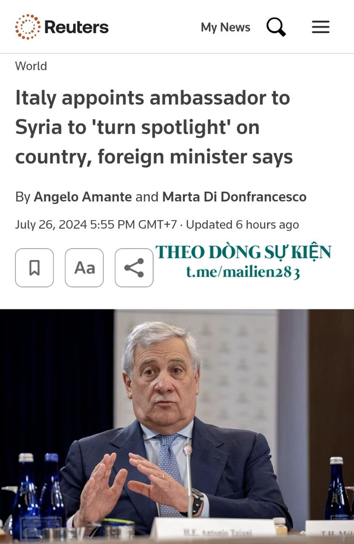 Ý bổ nhiệm đại sứ mới tại Cộng hòa Ả Rập Syria, trở thành quốc gia G7 đầu tiên khôi phục quan hệ với chế độ Bashar al-Assad. - Reuters