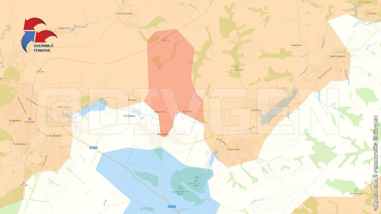 Tổng diện tích diễn ra giao tranh: 1.564² km Chiều dài chiến tuyến: 86,6 km Độ sâu xâm nhập: lên đến 36 km 🟧 Kiểm soát của Ukraina: 1.287² km 🟨 Khu vực xám/khu vực được Nga tuyên bố: 1.607² km 🏁 Sự hiện diện của người Ukraina 💥 Báo cáo có giao tranh 🔴 Địa điểm RF chiếm lại, dẩy lui các cuộc giao tranh