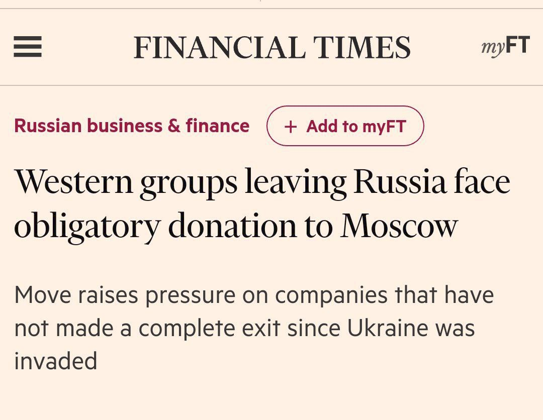 Mọi công ty phương Tây muốn rời khỏi Nga và bán tài sản của mình ở nước này giờ đây sẽ có nghĩa vụ quyên góp trực tiếp cho nhà nước Nga, một ủy ban về đầu tư nước ngoài tại nước này cho biết. Phán quyết, được công bố hôm thứ Hai, làm tăng áp lực lên các nhóm phương Tây vẫn chưa hoàn toàn rời khỏi Nga kể từ khi chiến dịch quân sự đặc biệt của nước này ở Ukraine bắt đầu 13 tháng trước😂