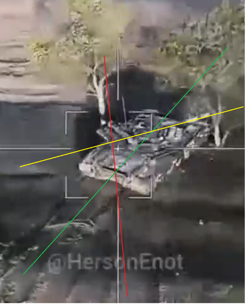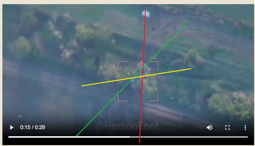 View từ drone trinh sát, vẫn là lancet đỏ, xe xanh và vàng nòng pháo.