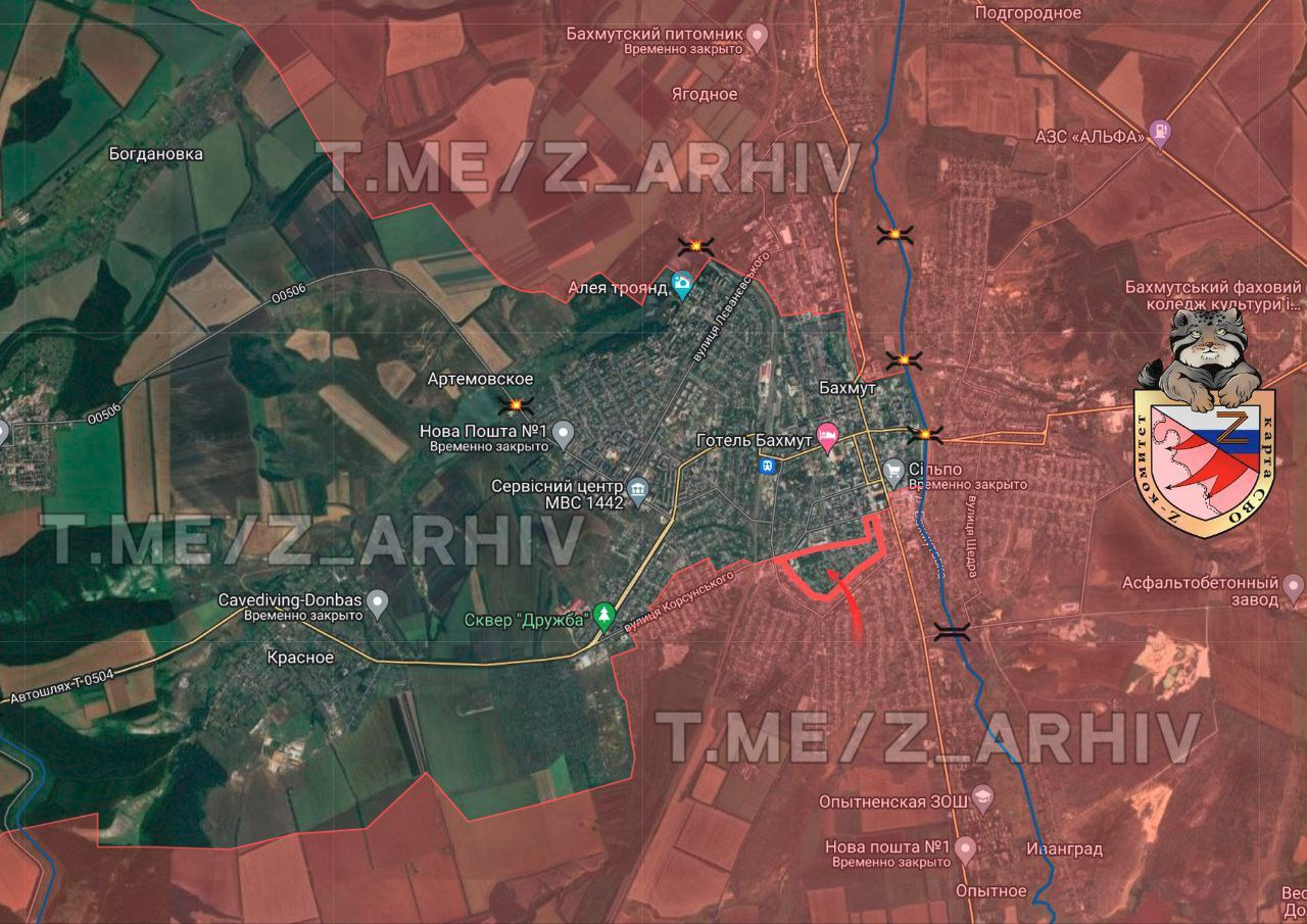 Có báo cáo rằng các chiến binh của Wagner PMC đang xông vào tòa nhà của chính quyền quận và hội đồng thành phố Bakhmut, Lực lượng Vũ trang Ukraine đang rút lui vào trung tâm thành phố từ các đường Bakhmutskaya và Blagoveshchenskaya