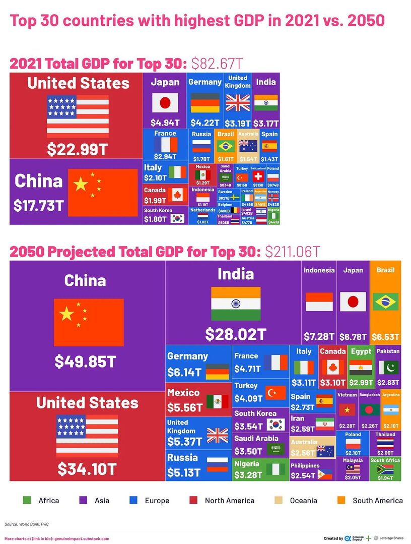 Em đính kèm cái ảnh về dự báo GDP các nước trên thế giới năm 2050 so với 2020 để các cụ thấy Ấn Độ nó sẽ như thế nào trong những năm tới đây nhé. Mà cái này còn là GDP danh nghĩa, GDP PPP nó còn vượt xa Mỹ cơ.