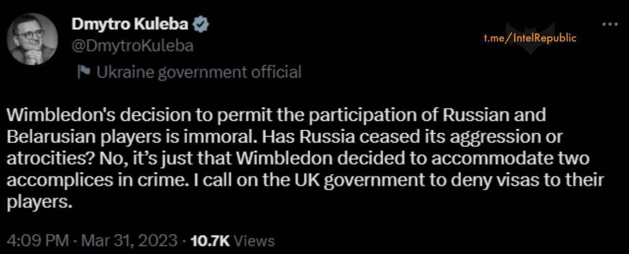 🇺🇦 Quyết định cho phép các tay vợt Nga và Belarus tham gia giải quần vợt Wimbledon là thất đức - Bộ trưởng Ngoại giao Ukraine "CRYBABY" Kuleba.