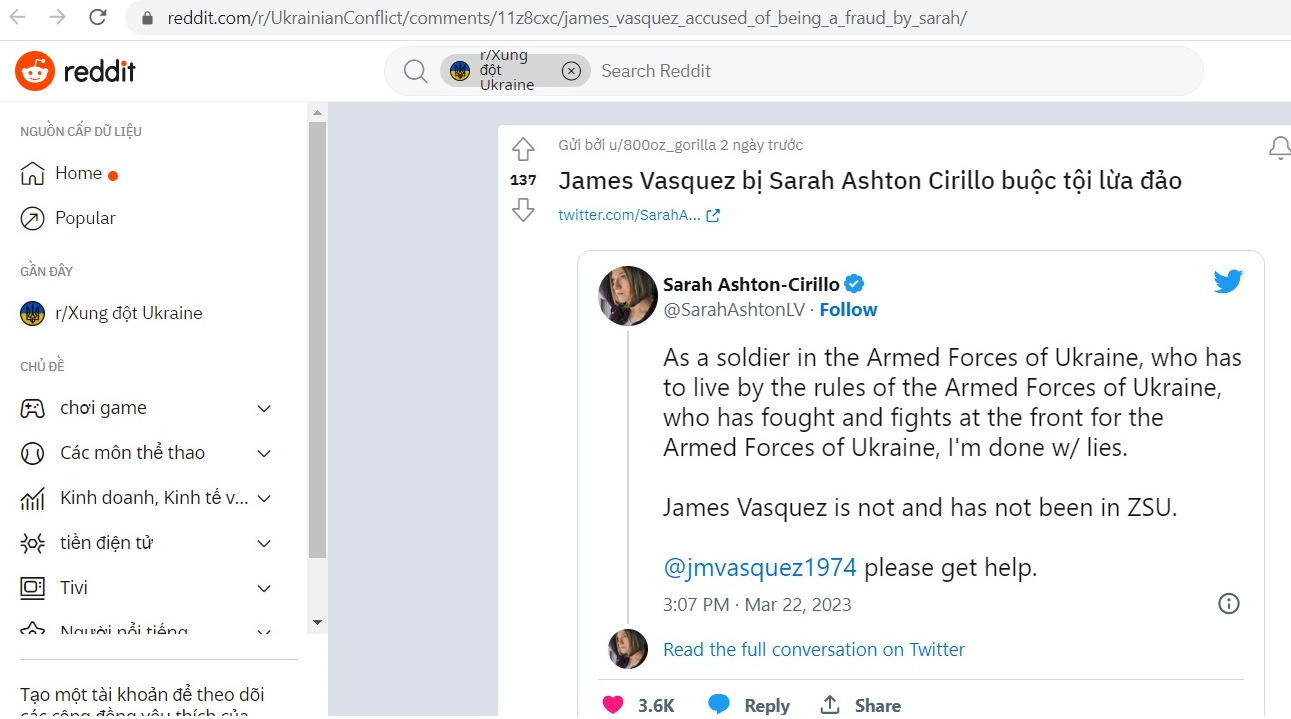 Vụ việc của James Vaques bị vỡ lở sau khi Sarah Ashton-Cirillo, một nhà báo người Mỹ đã nhập ngũ để chiến đấu trong quân đội U đăng twitter bóc fake (ngày 22/3/2023 mới đét luôn)