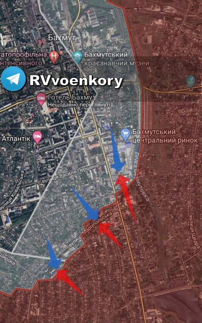 ▪️Giao tranh ác liệt vẫn tiếp diễn ở khu vực Chợ Trung tâm và dọc theo các đường phố Bazarnaya và Nezalezhnosti. Chỉ huy của PMC "Wagner" đã triển khai thêm 7 nhóm tấn công đến khu vực này.
