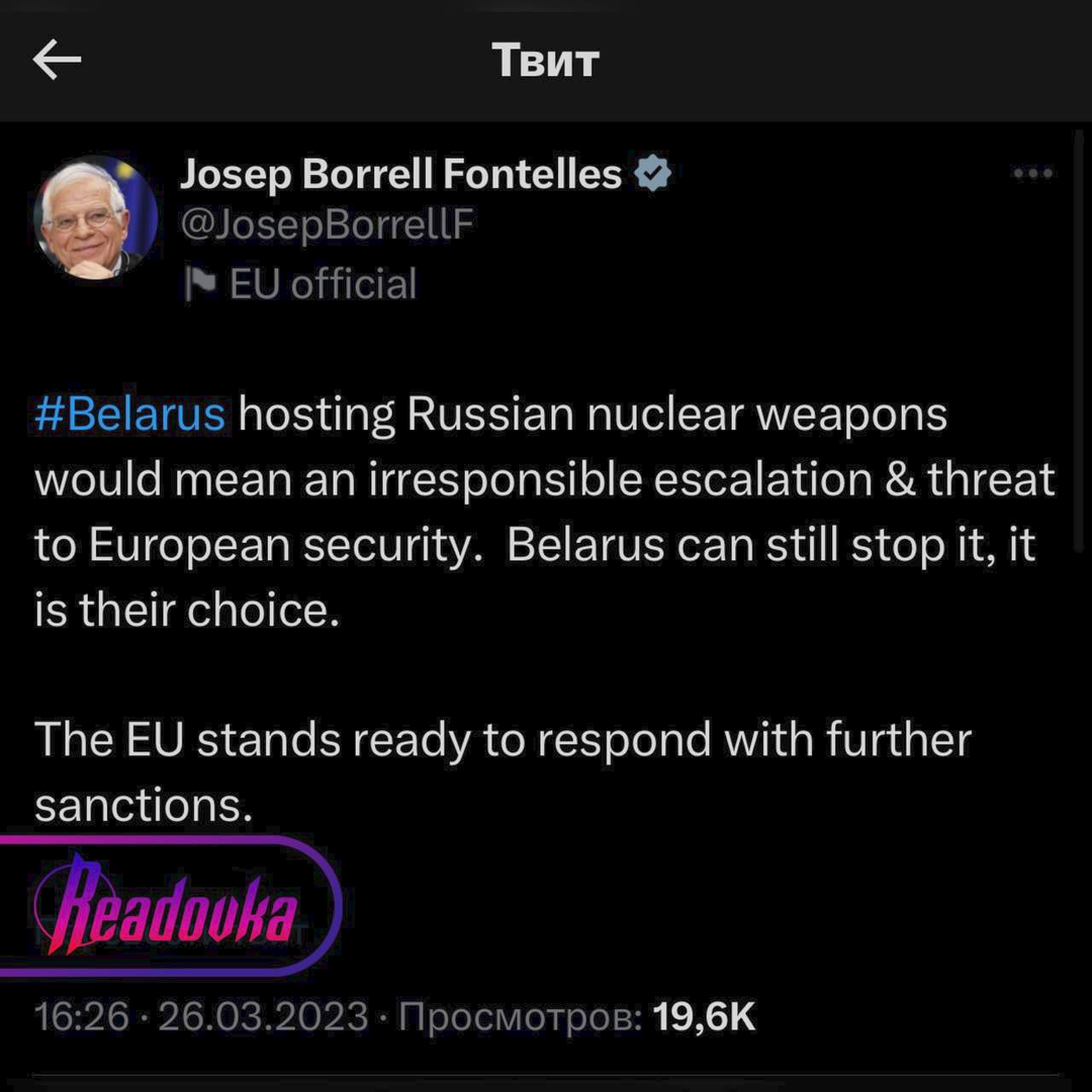 Người đứng đầu cơ quan ngoại giao của EU, Josep Borrel, đã công bố các mối đe dọa mới về việc áp đặt các biện pháp trừng phạt nhằm đáp trả kế hoạch triển khai vũ khí hạt nhân chiến thuật của Nga ở Belarus. Gọi việc triển khai vũ khí hạt nhân chiến thuật ở Belarus là "sự leo thang vô trách nhiệm", Borrell cảnh báo về "các lệnh trừng phạt tiếp theo" đối với Nga.
