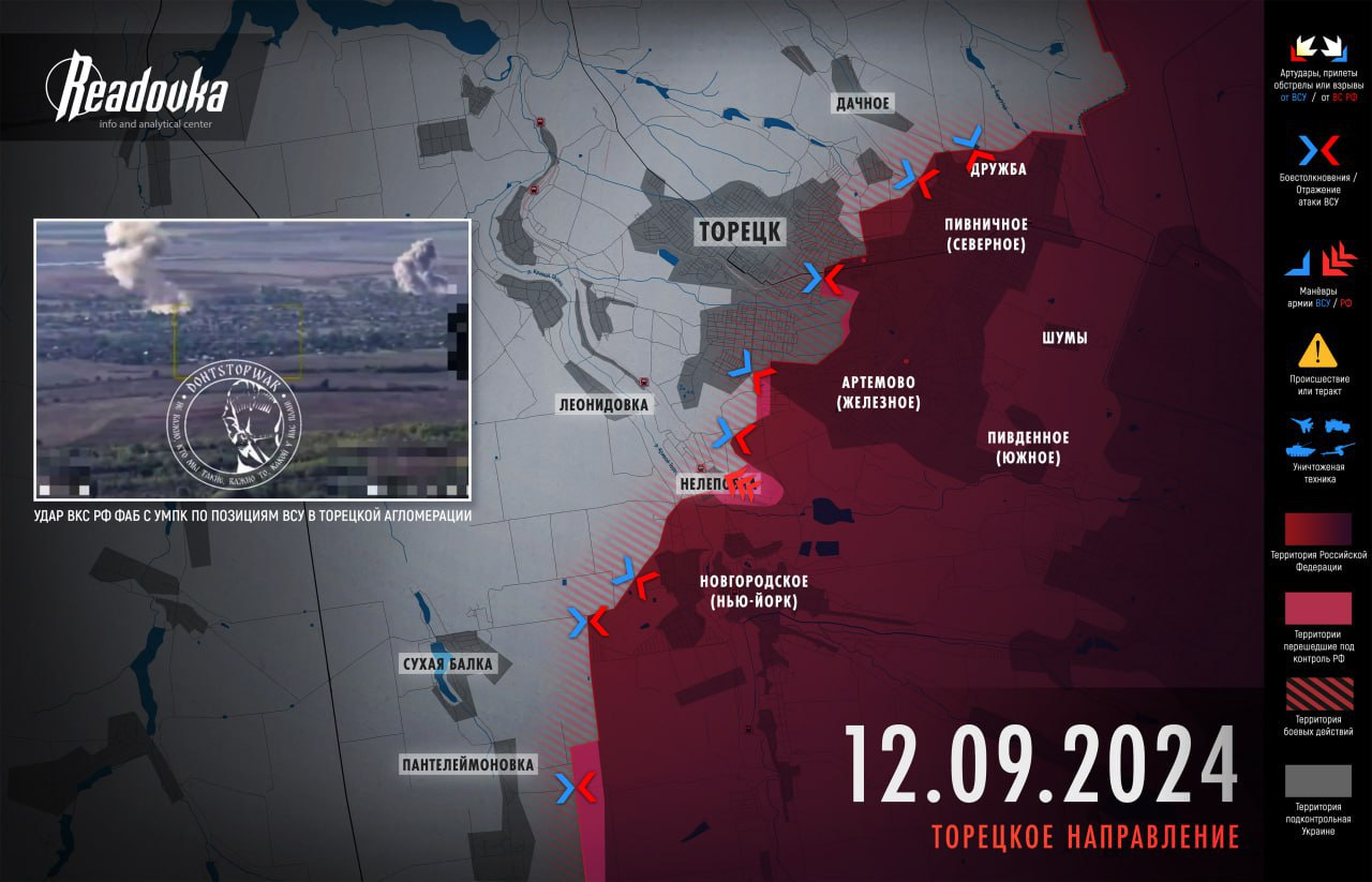 Lực lượng vũ trang Nga đã xuyên thủng hàng phòng ngự của Lực lượng vũ trang Ukraine ở phía đông Toretsk và đang tiến về trung tâm của nó - tình hình theo hướng Toretsk vào cuối ngày 12 tháng 9