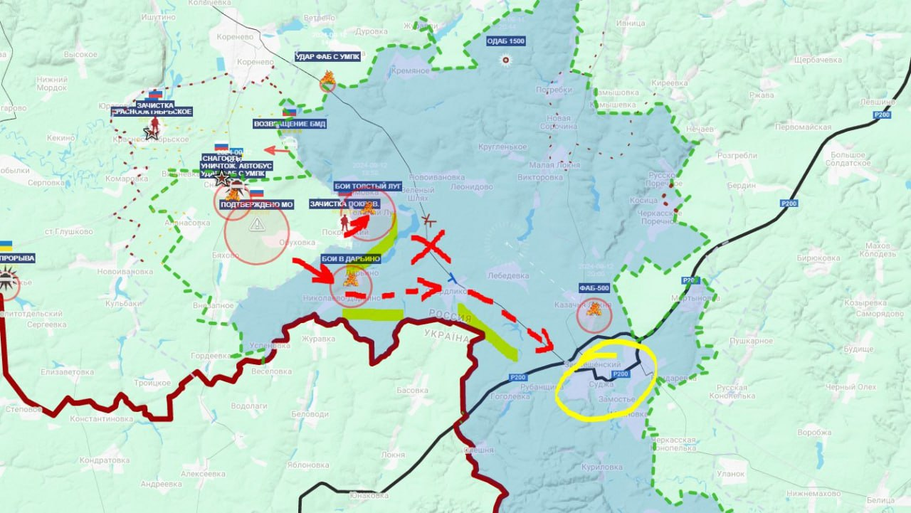 Tình hình khu vực biên giới sáng 13/9 - Lực lượng vũ trang Ukraine tiếp tục cố gắng tiến vào khu vực Kursk từ hướng mới (trên bản đồ dưới đây thì mũi này nằm ở rìa bên trái).