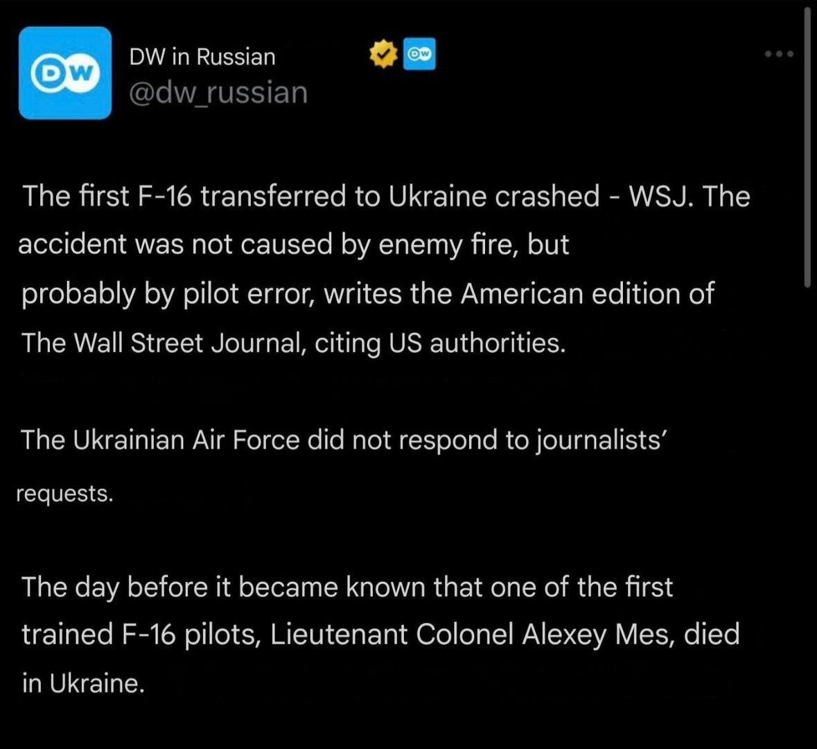 "Ukraine không nêu nguyên nhân khiến chiếc F-16 rơi. Nhà lập pháp người Ukraine Maryana Bezuglaya nói rằng, "chiếc F-16 của phi công Oleksiy 'Moonfish' Mes đã bị hệ thống tên lửa phòng không Patriot bắn hạ do thiếu sự phối hợp giữa các đơn vị chiến đấu", theo TASS."