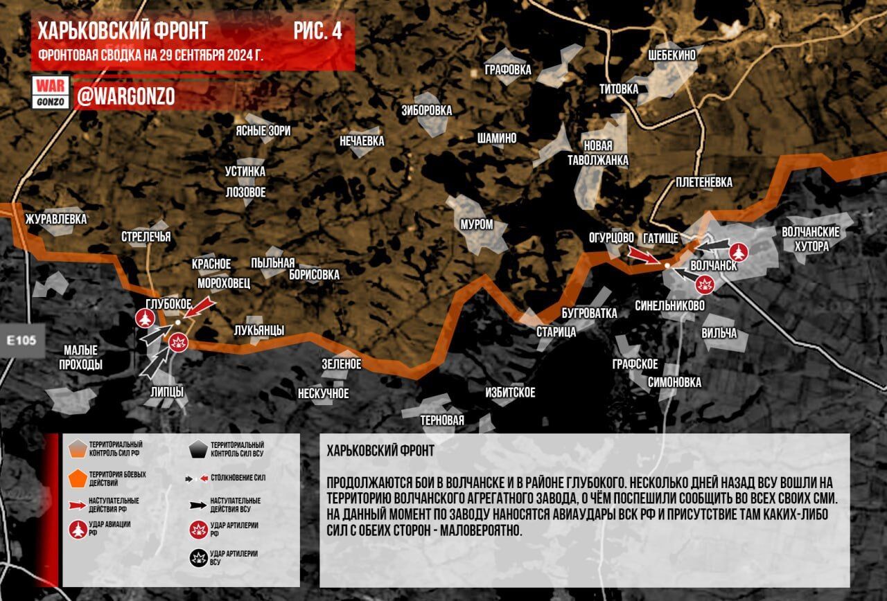 Mặt trận Kharkov. Giao tranh vẫn tiếp diễn ở Volchansk và khu vực Glubokoye. Vài ngày trước, Lực lượng vũ trang Ukraine đã tiến vào lãnh thổ của Nhà máy tổng hợp Volchansky và họ đã vội vàng đưa tin trên tất cả các phương tiện truyền thông của mình. Hiện tại, các cuộc không kích đang được Lực lượng vũ trang Nga thực hiện tại nhà máy và khó có khả năng xảy ra sự hiện diện của bất kỳ lực lượng nào ở cả hai bên. (Hình 4)
