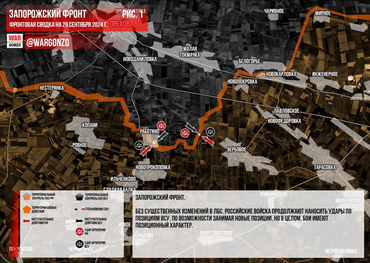 Mặt trận Zaporozhye. Không có thay đổi đáng kể nào đối với LBS. Quân đội Nga tiếp tục tấn công các vị trí của Lực lượng vũ trang Ukraine, chiếm giữ các vị trí mới bất cứ khi nào có thể, nhưng nhìn chung, các trận chiến đều mang tính chất vị trí. (Hình 1)