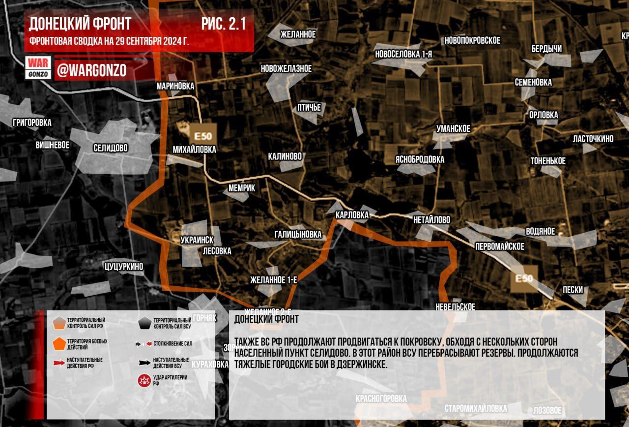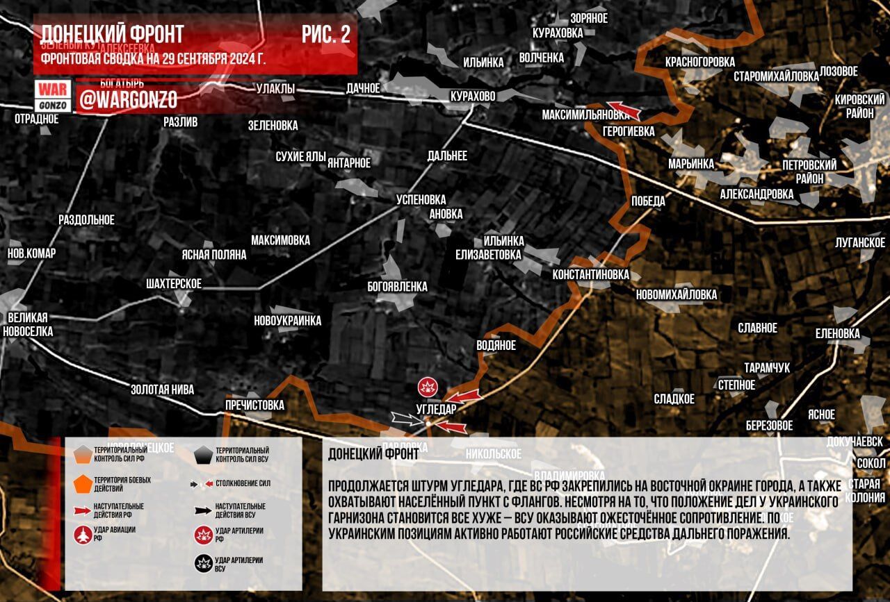 Mặt trận Donetsk. Cuộc tấn công vào Vugledar vẫn tiếp tục, nơi Lực lượng vũ trang Nga đã thiết lập được chỗ đứng ở ngoại ô phía đông thành phố, đồng thời bao vây khu vực đông dân cư từ hai bên sườn. Bất chấp tình hình đồn trú của Ukraine ngày càng tồi tệ, Lực lượng vũ trang Ukraine vẫn kháng cự quyết liệt. Vũ khí tầm xa của Nga đang tích cực tấn công các vị trí của Ukraine. Ngoài ra, Lực lượng vũ trang Nga tiếp tục tiến về phía Pokrovsk, bỏ qua làng Selidovo từ nhiều phía. Lực lượng vũ trang Ukraine đang chuyển quân dự bị tới khu vực này. Giao tranh đô thị khốc liệt vẫn tiếp diễn ở Dzerzhinsk. (Hình 2)