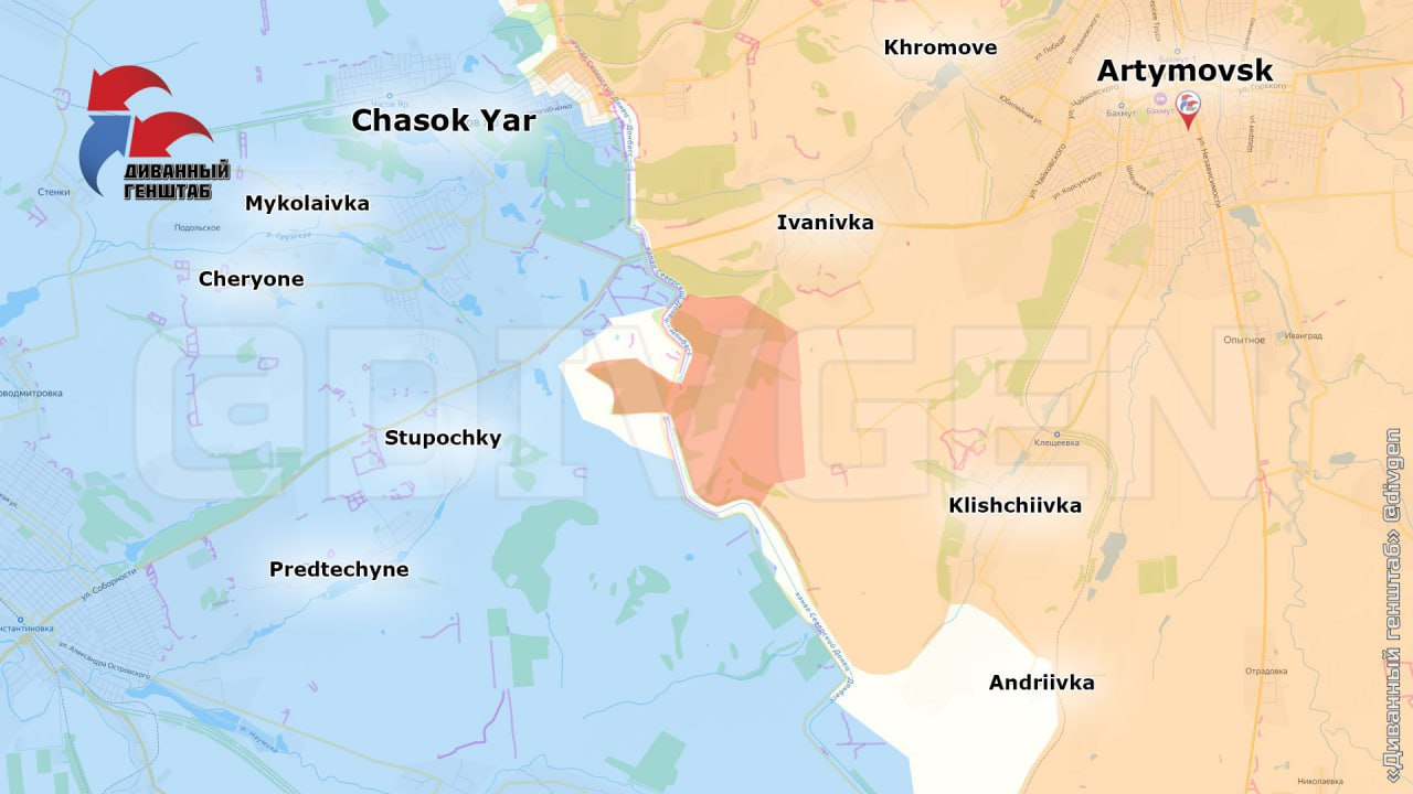 Quân đội Nga đã đột phá vượt kênh đào Severy-Donet Donbass ở hướng nam Chasok Yar. Cùng với hướng bắc ở Kalinina, quân đội Nga đang từng bước khép góc Chasok Yar theo thế ba mặt giáp công.
